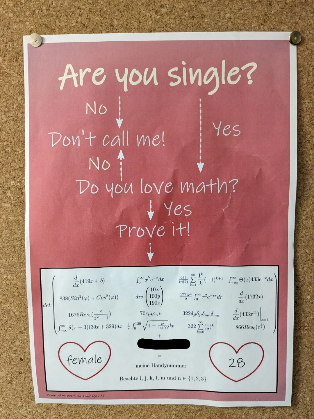an A4 print on a pin board, having a flow chart saying: Are you single? Do you love math? Prove it! And a 4 times 4 matrix containing various complicated mathematical expressions. The determinant of the matrix is her phone number, which you are allowed to call if you are approximately her age (27 to 35). I censored a part to hopefully obscure her number enough.