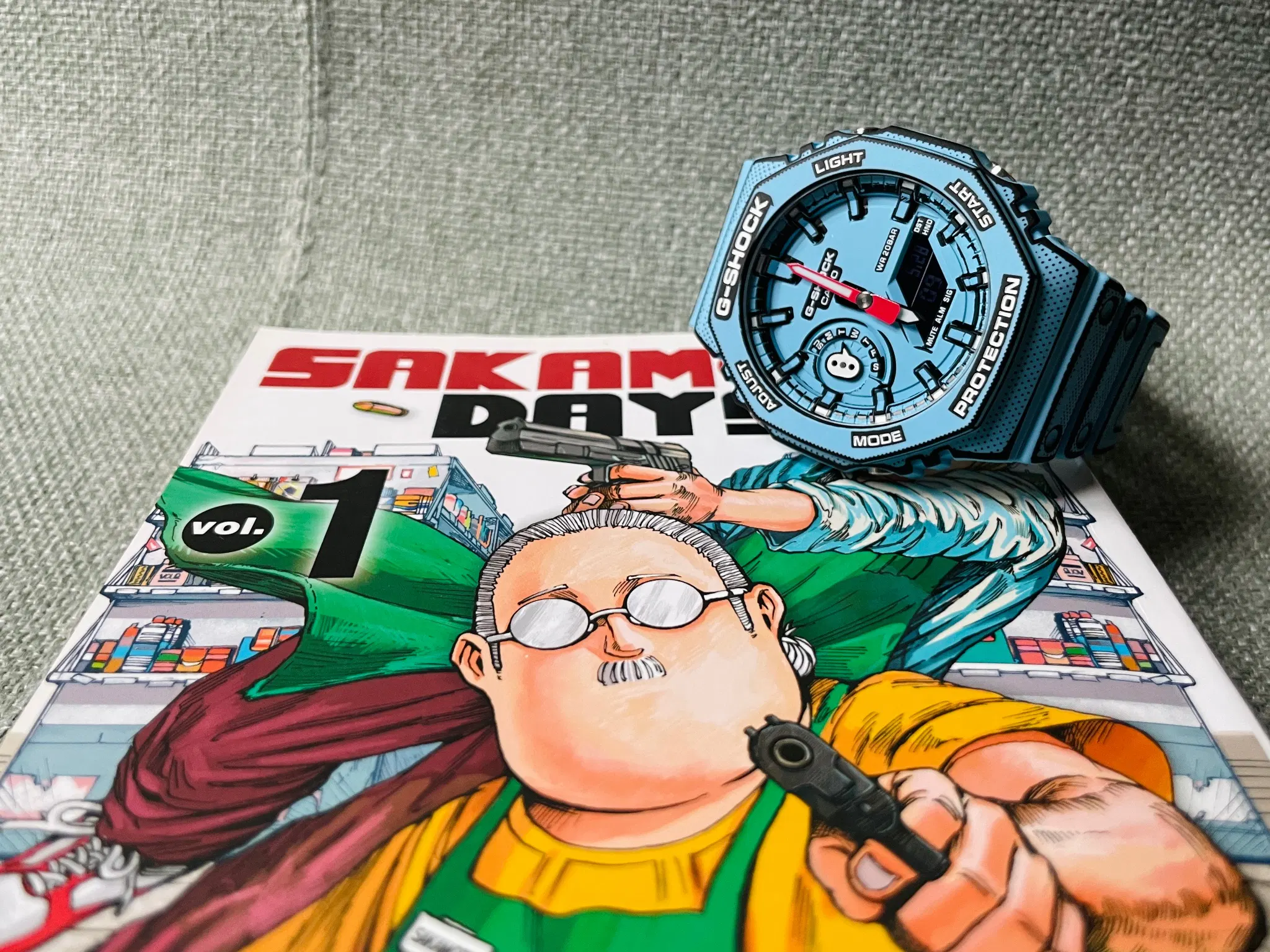 Photo of light blue octagon G-Shock with cartoon print on a Manga strip book