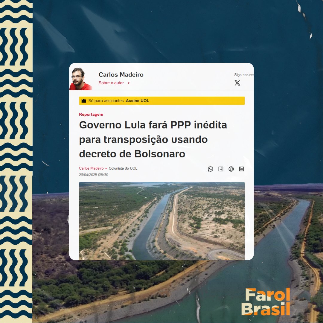 O Governo Bolsonaro tentou fazer uma PPP (Parceria Público Privada) para privatizar a distribuição de águas da transposição do Rio São Francisco. Não conseguiu. O Governo Lula aproveitou um decreto de Bolsonaro e vai fazer a privatização. Fica com o "mercado" até 2046!