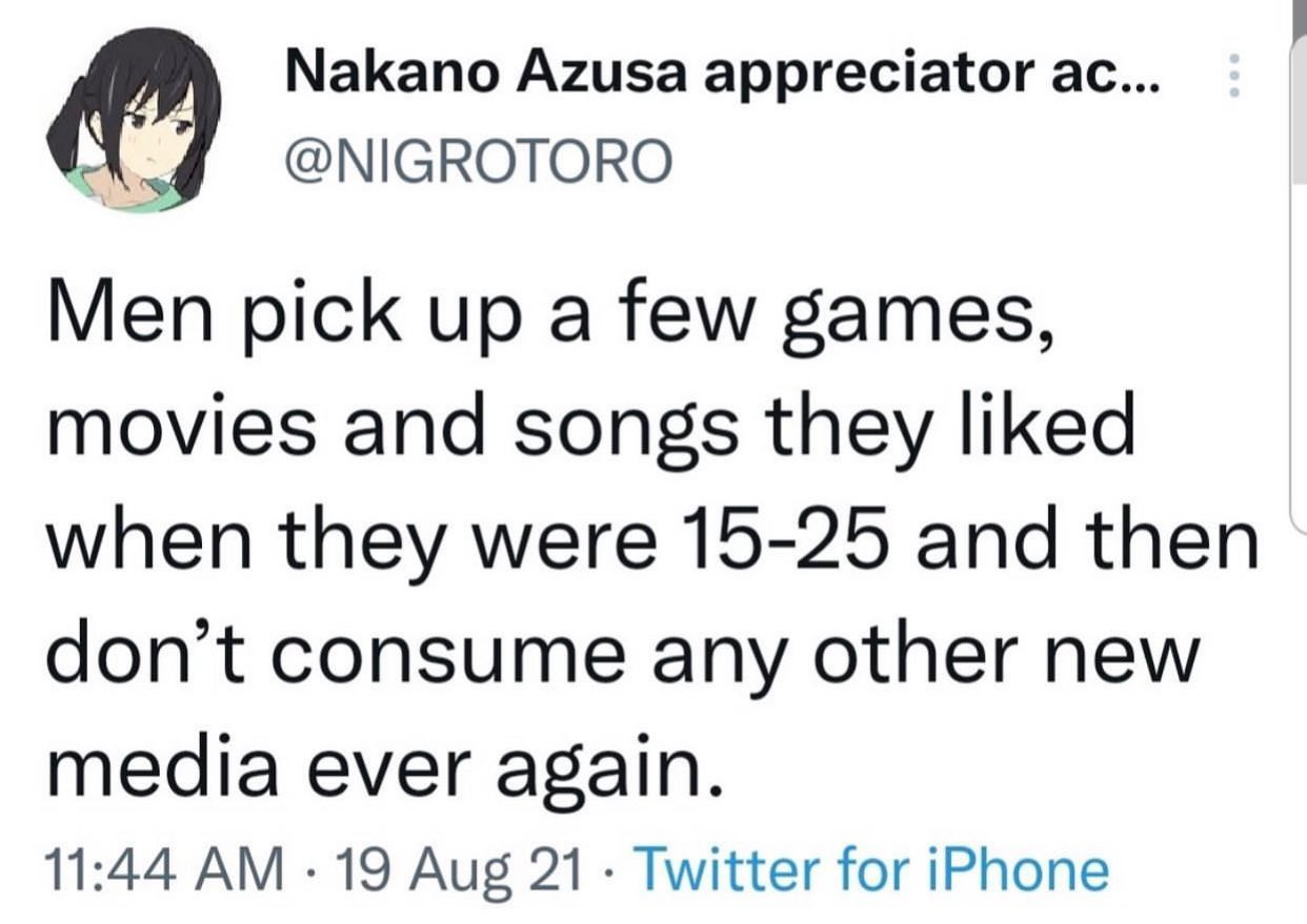 @waifu Most of my media consumption happened then. It drastically slowed down in my late 20s. Mostly true I guess. -