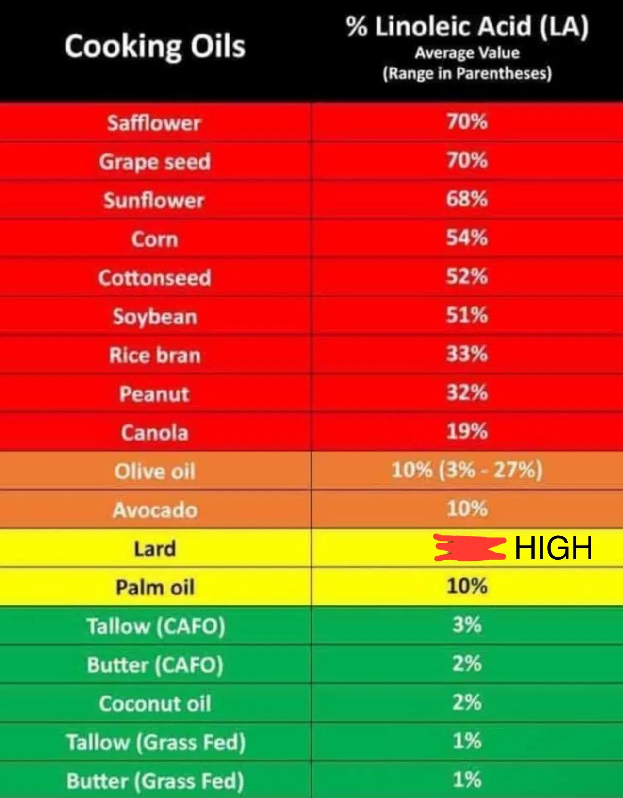 @sickburnbro@poa.st I think this is kinda over simplified. I still consider it to be a better frying option than rapeseed even though it’s higher on this chart. But I don’t know why. Just a gut feeling. Literally and figuratively. Stuff fried in canola makes me feel worse.