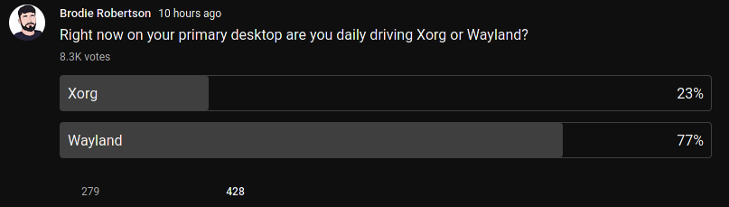 We're now at 77% Wayland to 23% Xorg, and keep in mind this is amongst an audience engaged enough to know the difference. Considering both major desktops and most major DEs default to Wayland I would expect higher amongst the general populace