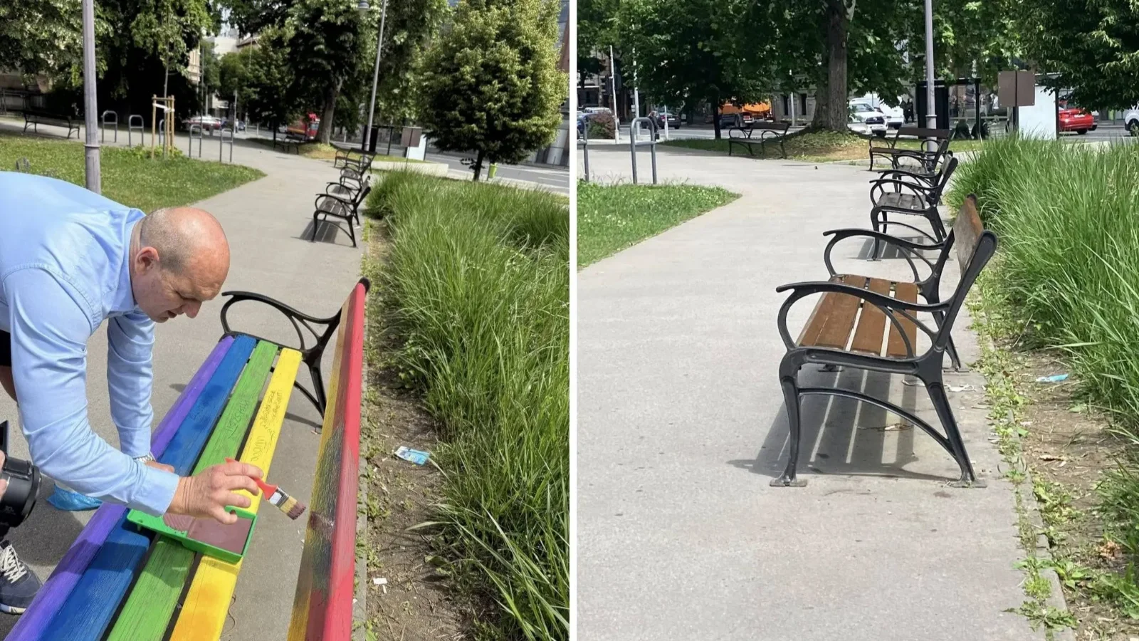 The leftist mayor painted a bench to be rainbow colored then a right wing politician repaired the damage.soberano likes this.