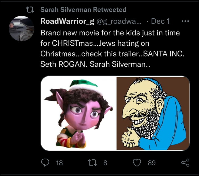 @WhitestTemplar @Heil_Honkler @Hoss I dunno, (((Sarah Silverman))) a yenta so insufferably Jewish that most of her own tribe hate her seemed pretty quick to use elves as a vector to express her inherently hebraic hatred of Christ / Christmas :KannaSip: -