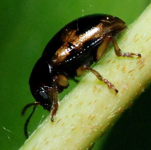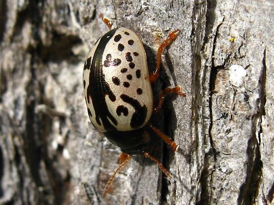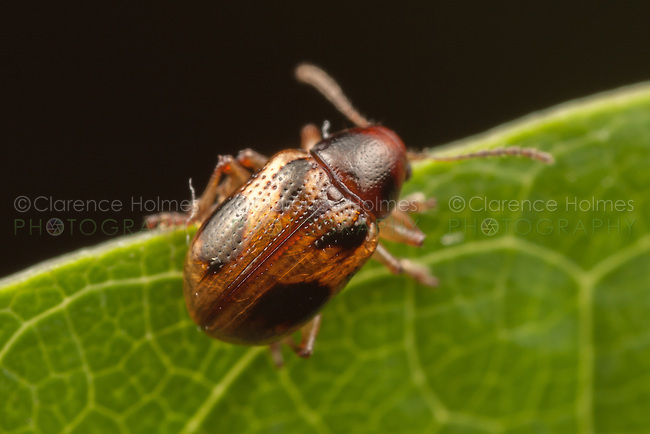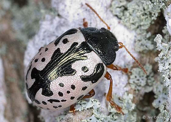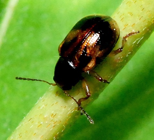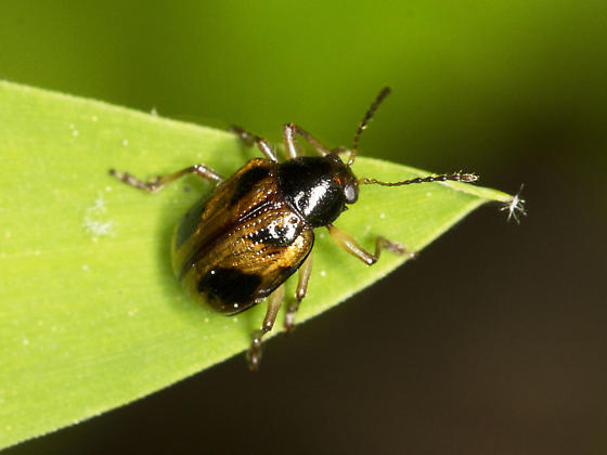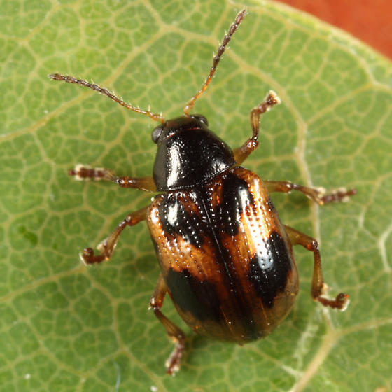 The Four-marked Oval Leaf Beetle (Paria quadrinotata) is a species of leaf beetle found in North America. It has a black body with golden legs, and golden wings with four black marks.