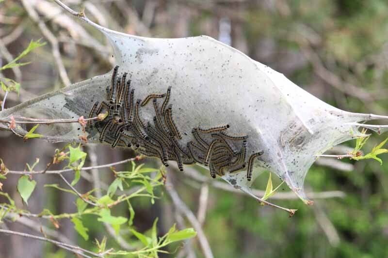 Once they finish feeding, they wander away from the nest and spin a white or yellowish silk cocoon in protected places on tree trunks, fences or buildings. The reddish-brown adult moths emerge about 3 weeks later. After mating, the females lay eggs on small branches that remain until the next spring.