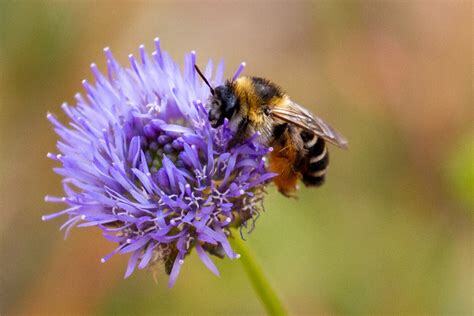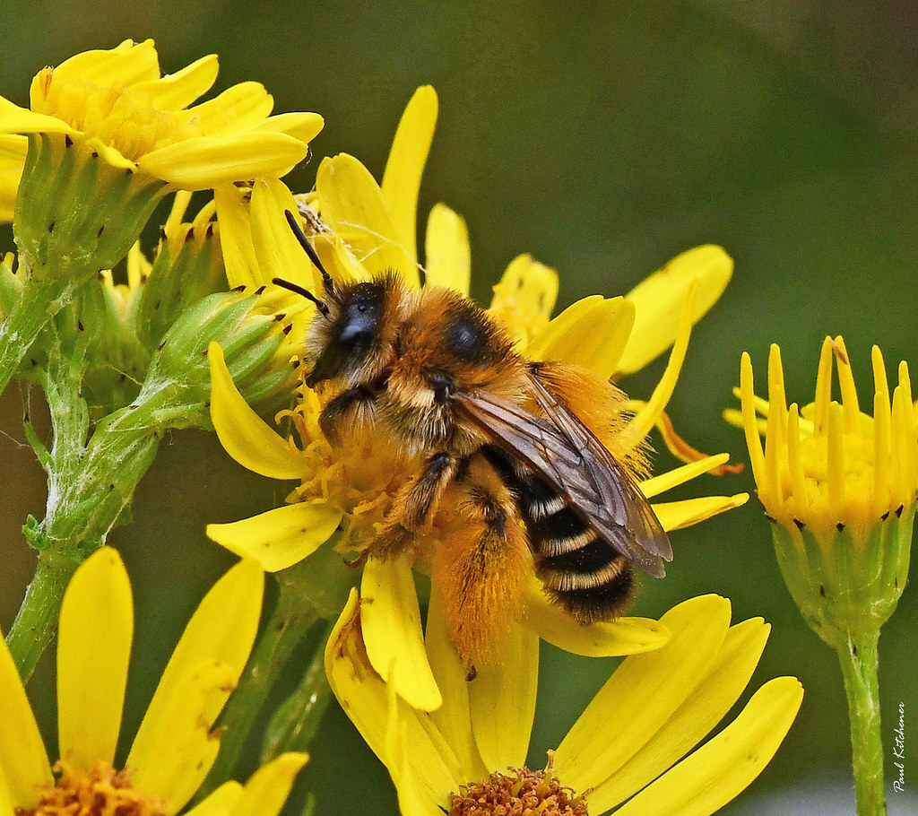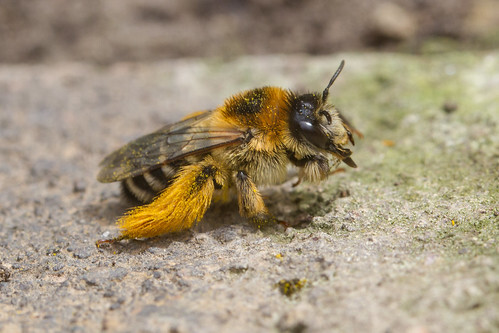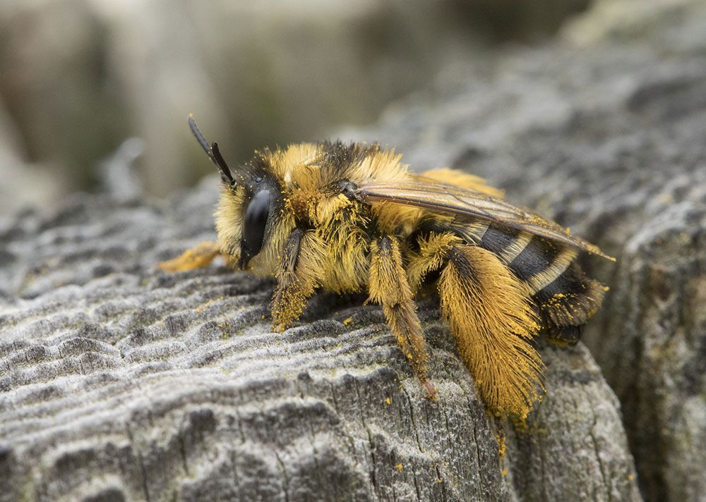 The pantaloon bee is a brown and golden-yellow furry mining bee with distinctive hairy hind legs. The bee’s back legs become swollen with pollen, giving them the appearance of wearing pantaloons. This medium to large bee also has a fuzzy black abdomen with grayish-white bands around it. Additionally, the bee has an easily recognizable furry golden-brown head.