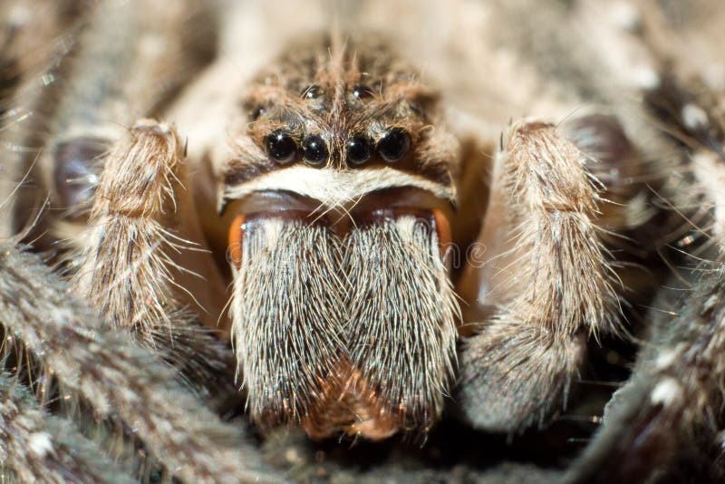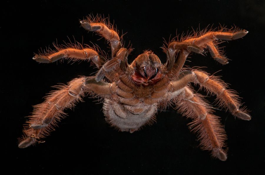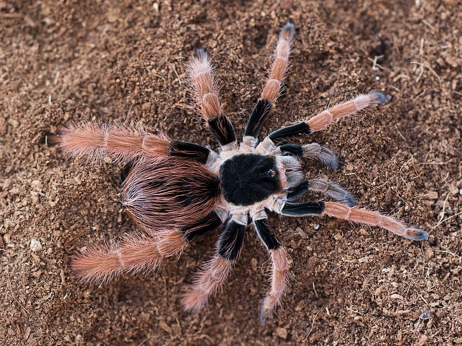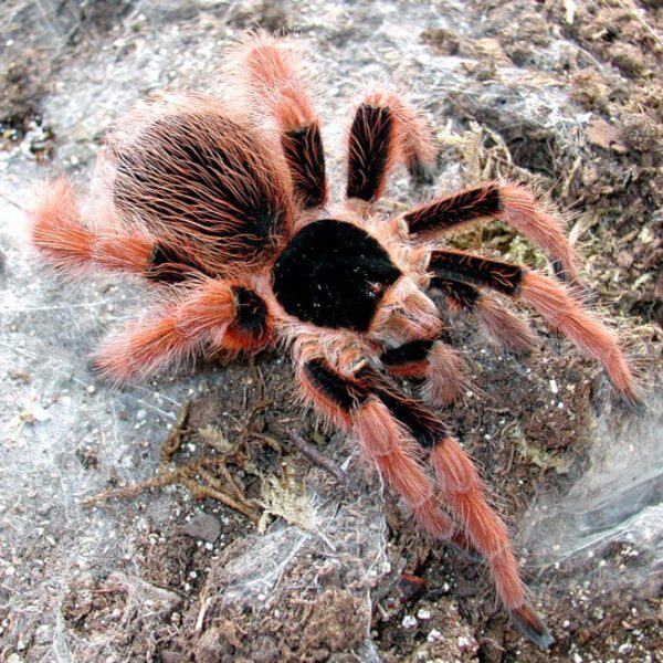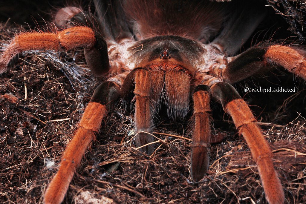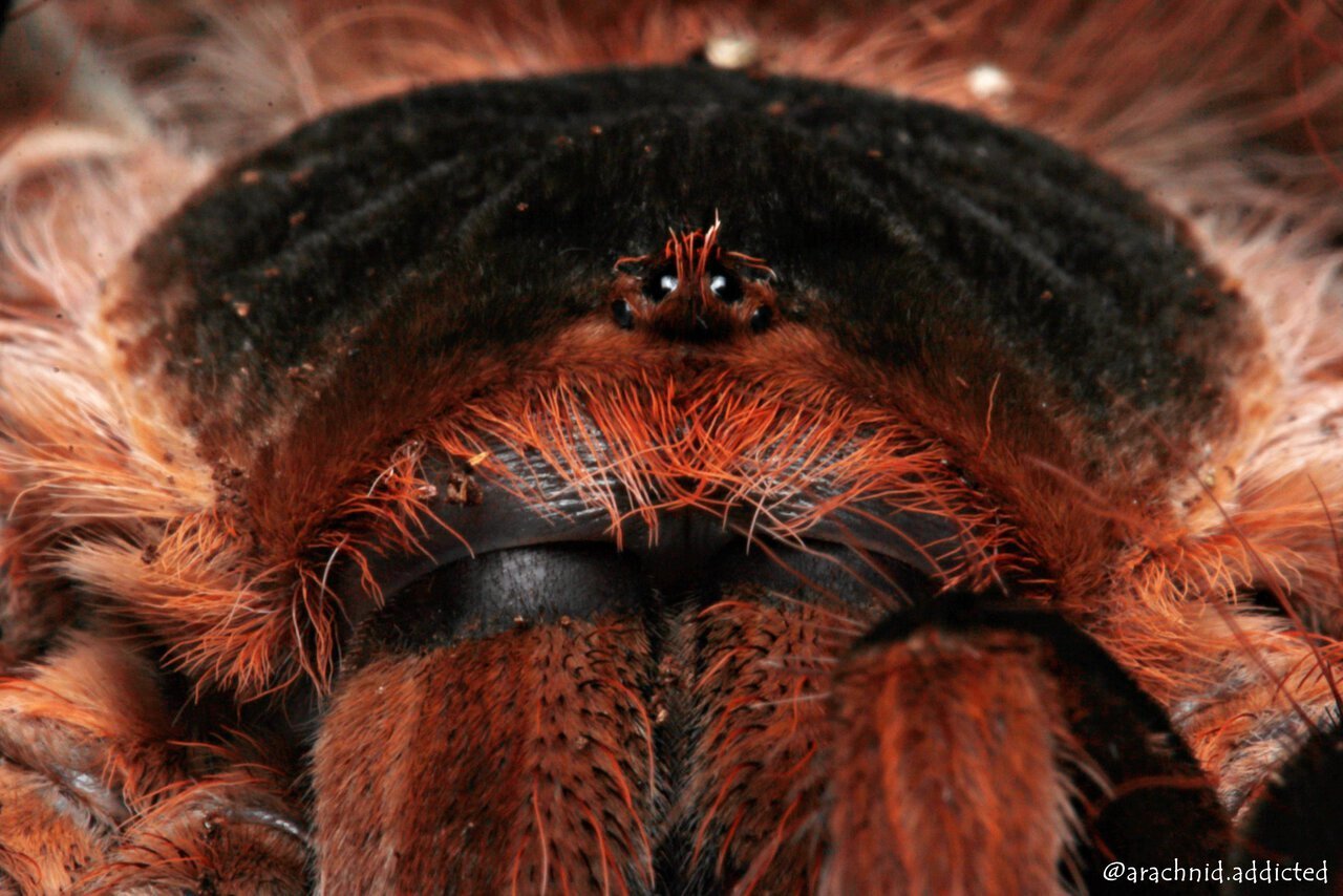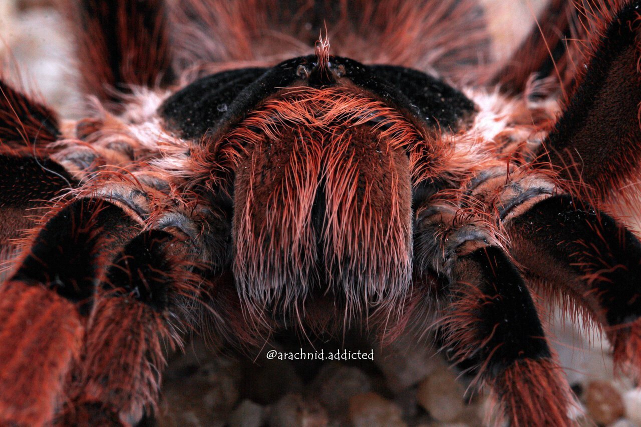 Megaphobema robustum, known as the Colombian giant tarantula or Colombian giant redleg, is found in the tropical rainforests of Colombia and Brazil near logs. It has a span of 6 to 8 inches and will eat crickets, other large insects, small lizards, and mice. Their carapace is a deep black color, with a pale orange color, the opisthosoma is also a deep black color covered with orange hairs. Most of the legs, with the exception of the femur which is also black, are a bright orange and are covered in orange hairs.