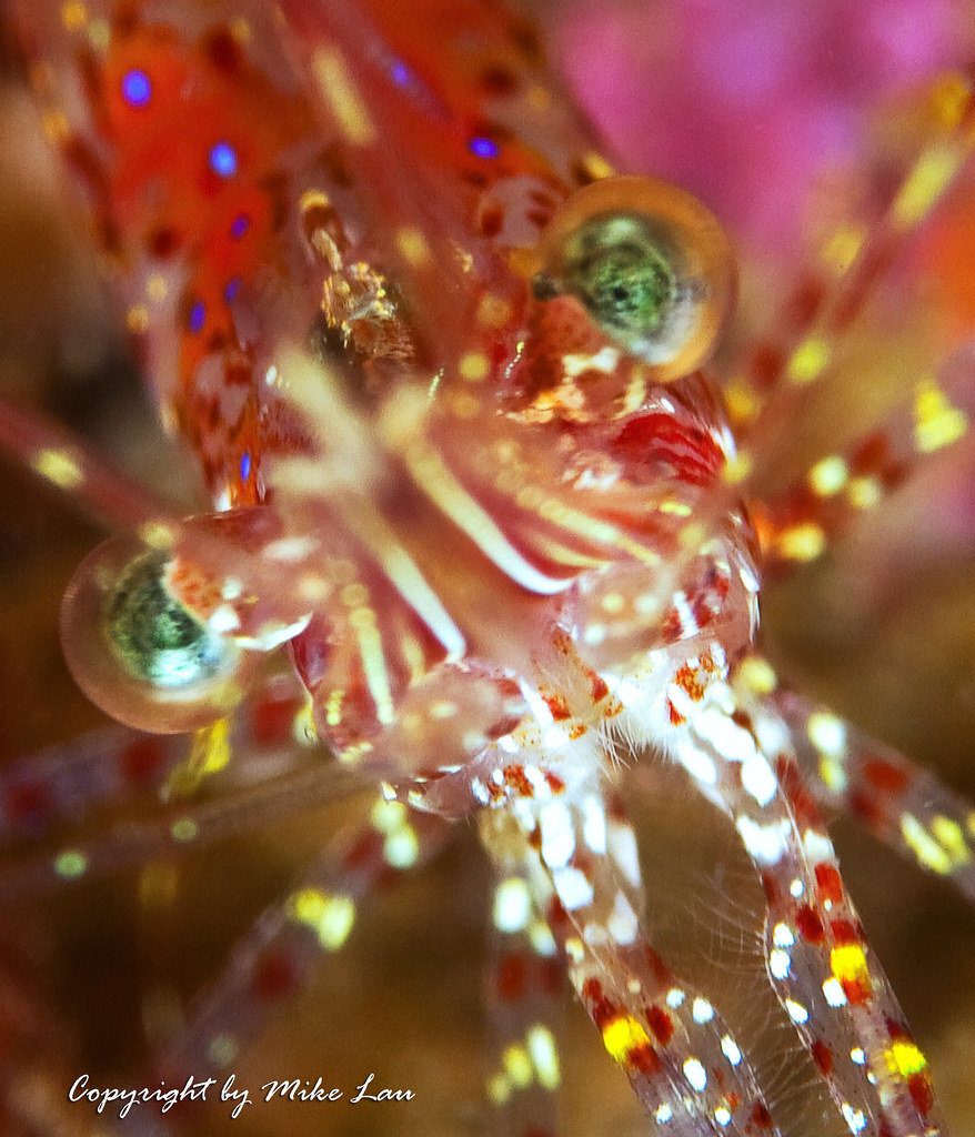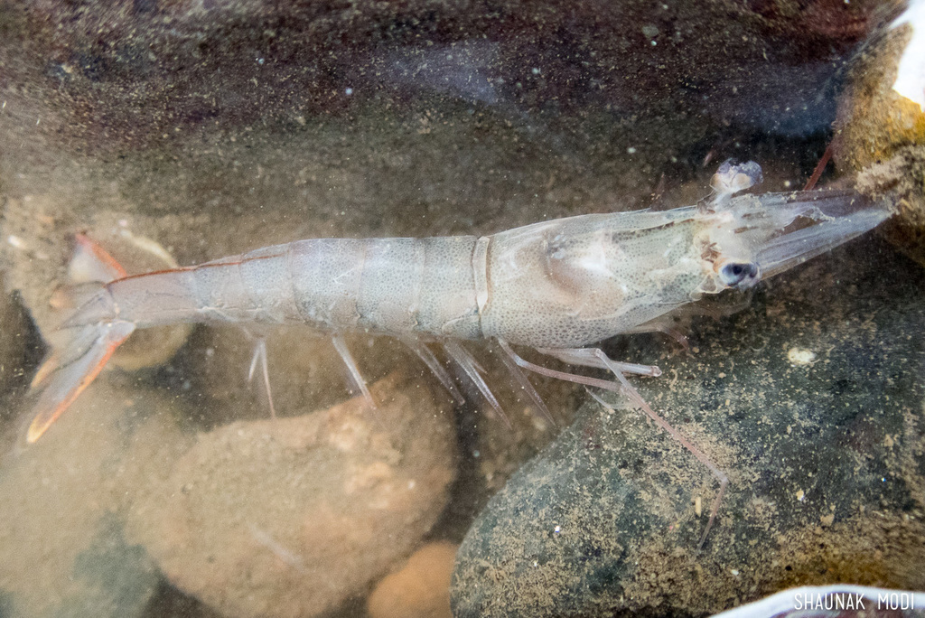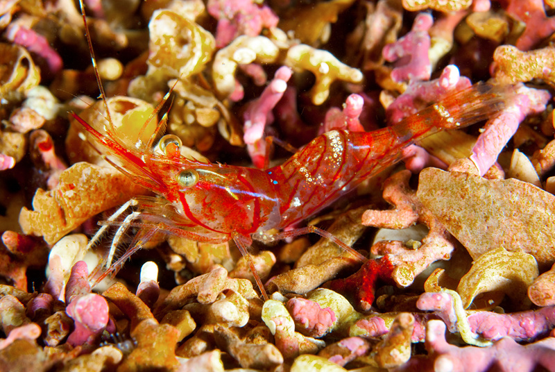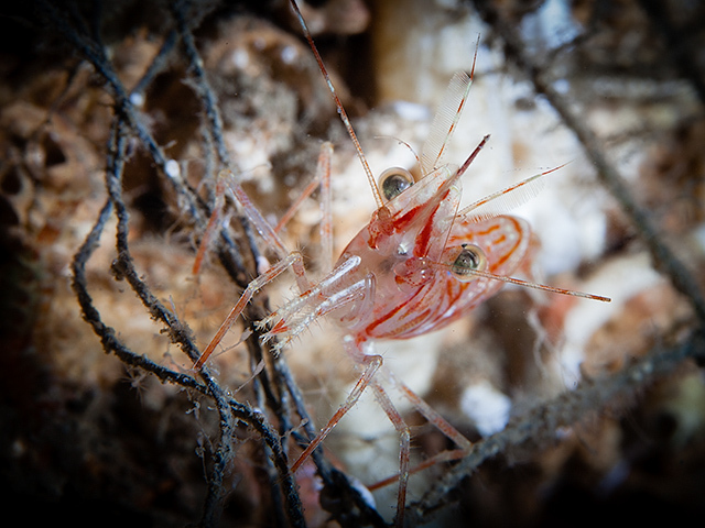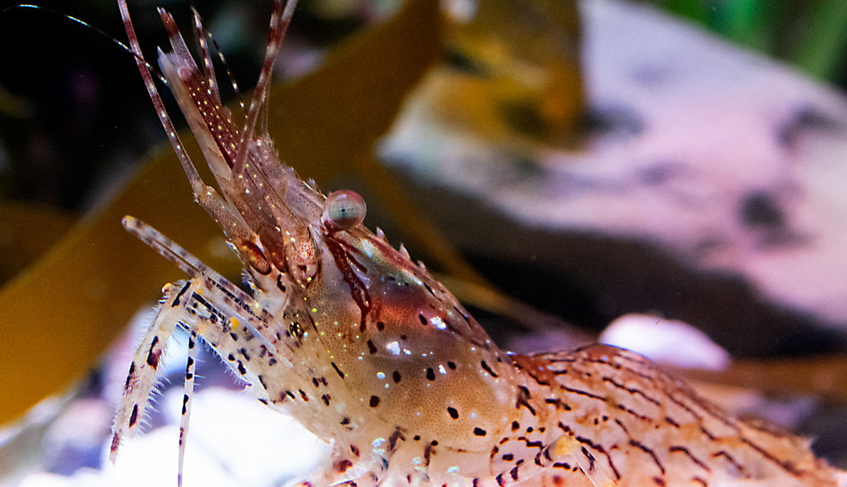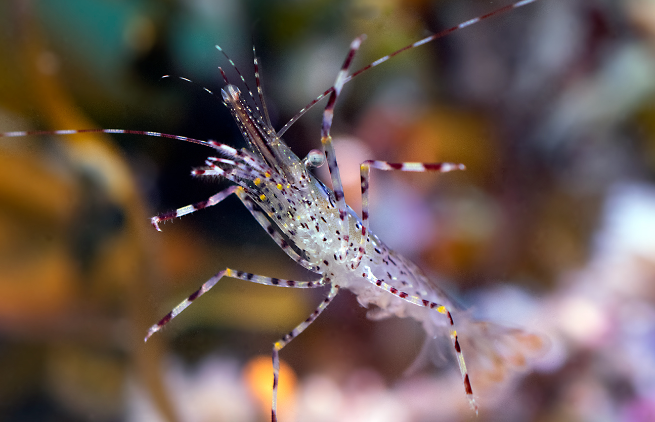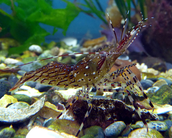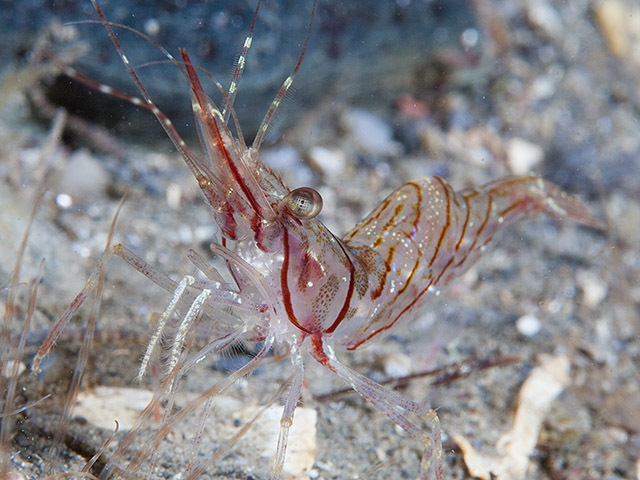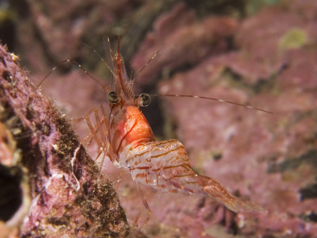 This shrimp has large antennae about the length of its body used for feeling around, with large eyes located directly behind them. Along with its large tail, the Coonstripe shrimp has 5 pairs of swimmerets used for forwards momentum.