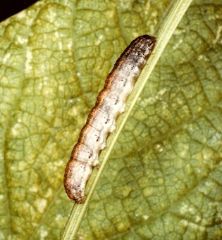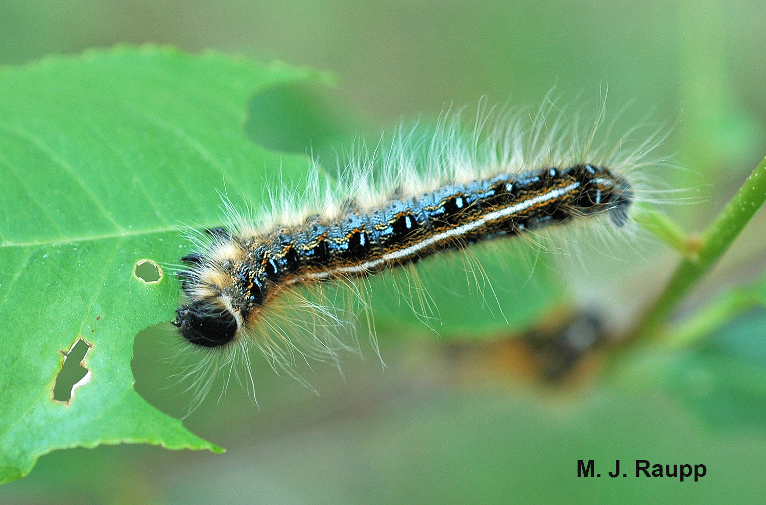 Caterpillars from one egg mass stay together to form a colony; caterpillars from two or more egg masses may unite to form one large colony. The hairy caterpillars are black with a white stripe down the back, brown and yellow lines along the sides, and a row of oval blue spots on the sides.