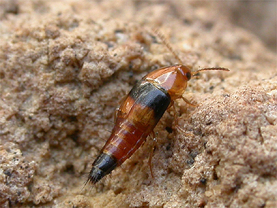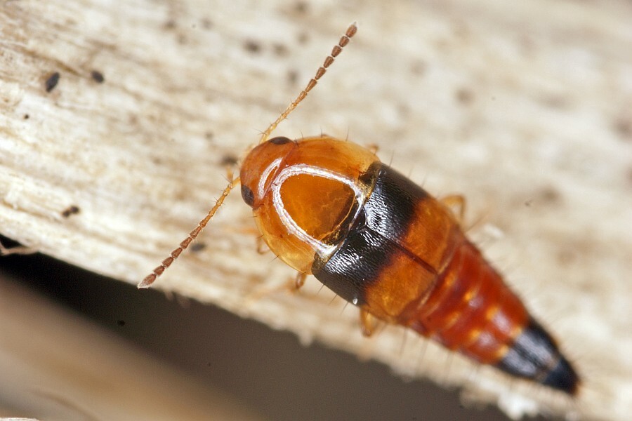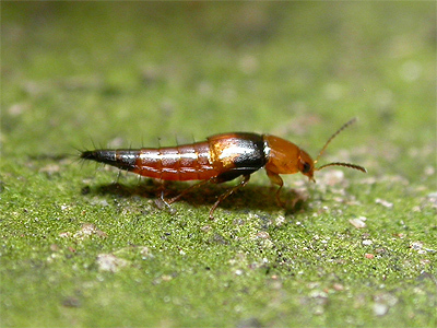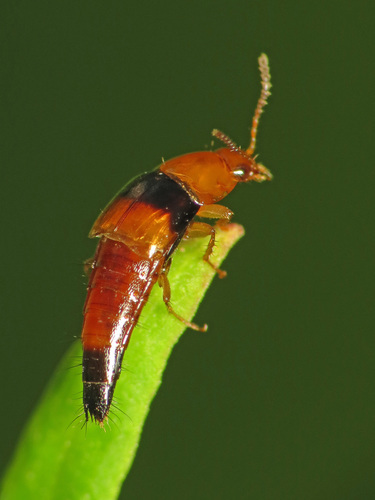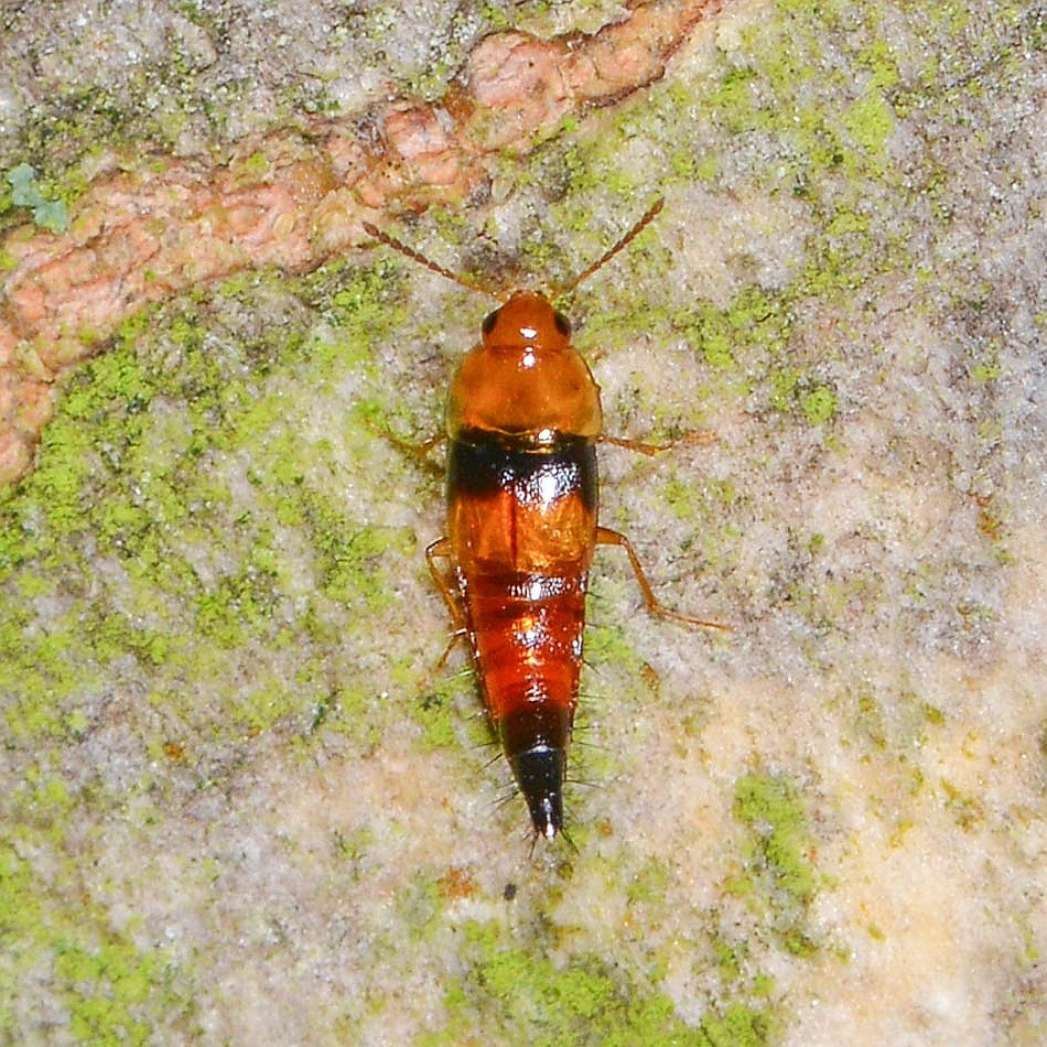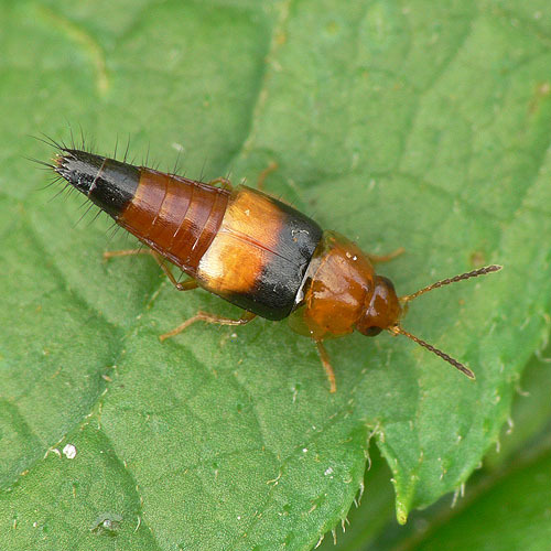 The Tachyporus obtusus rove beetle is an orange-brown species with black across the upper half of its wing cases and a black tip to its abdomen.