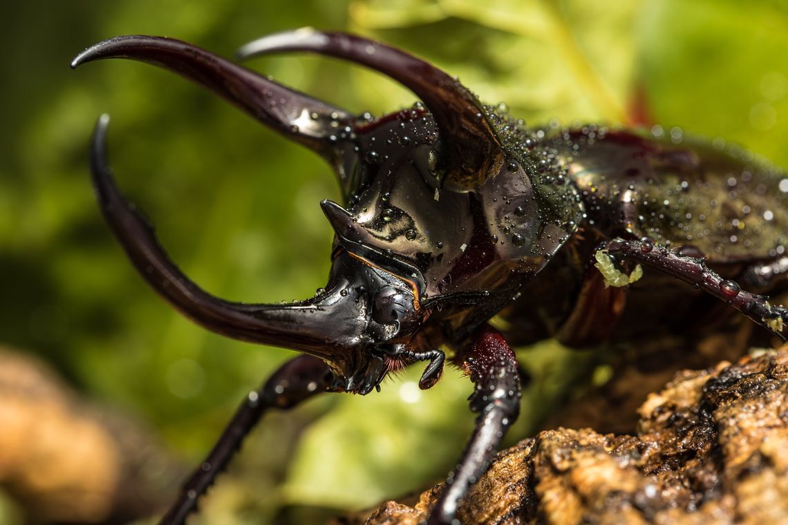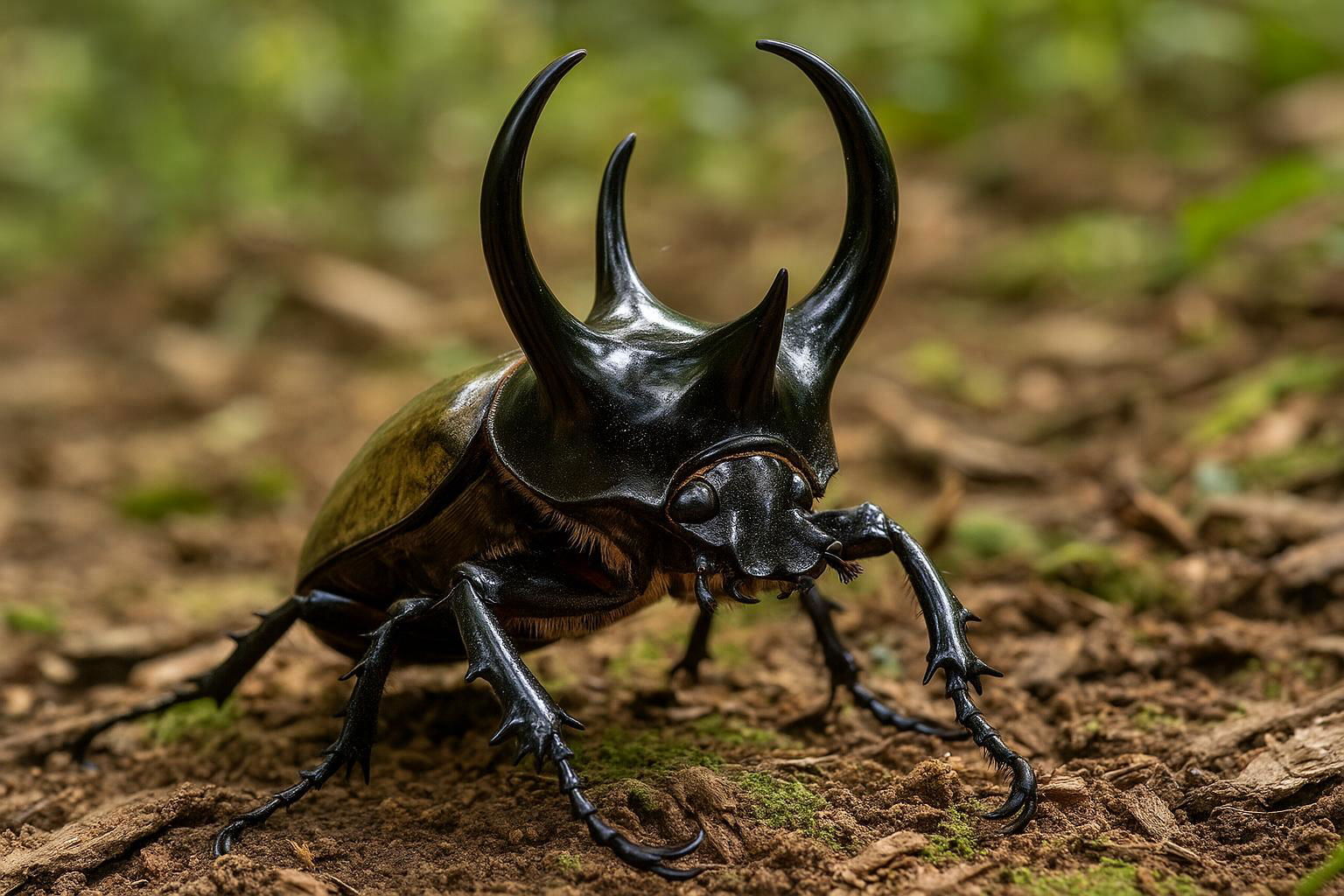 Sexual dimorphism in this species is easily noticeable. Males are much larger than their female counterparts. Females don’t have any horns, and their legs are also a lot shorter. Atlas Beetles have wide, rounded bodies ranging in color from a dark brown to a beautiful metallic green. Male Atlas Beetles have two long upper cephalic horns that curve outwards in a U shape. They also have a third equally long lower horn that curves upwards.