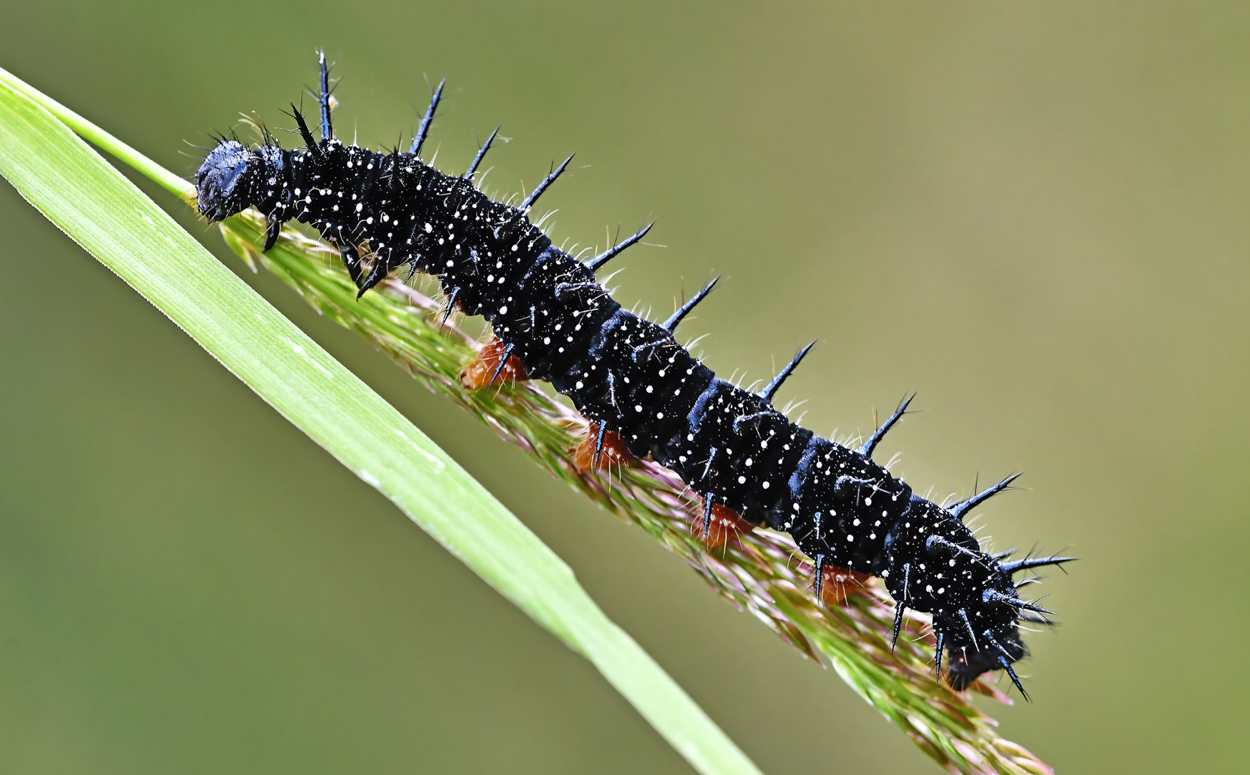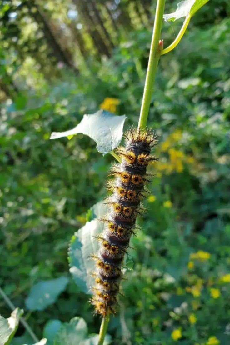 Peacock butterflies emerge in late summer from their cocoons and hibernate in winter. They hide in hollow trees, dead wood, sheds, and attics for seven to eight months until the next spring. When threatened by predators, these butterflies have several defense mechanisms. The first is to blend into the environment and imitate a leaf by remaining motionless. The second is to spread its wings, revealing their eyespots to appear intimidating. During the winter, they may hiss to deter predators who can't see the eyespots due to low lighting conditions.