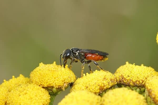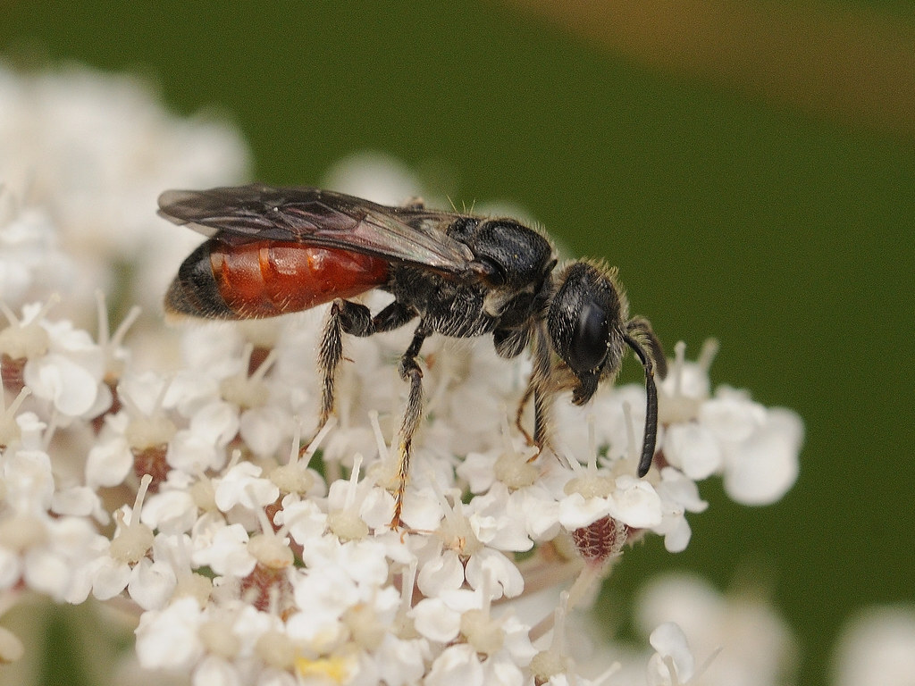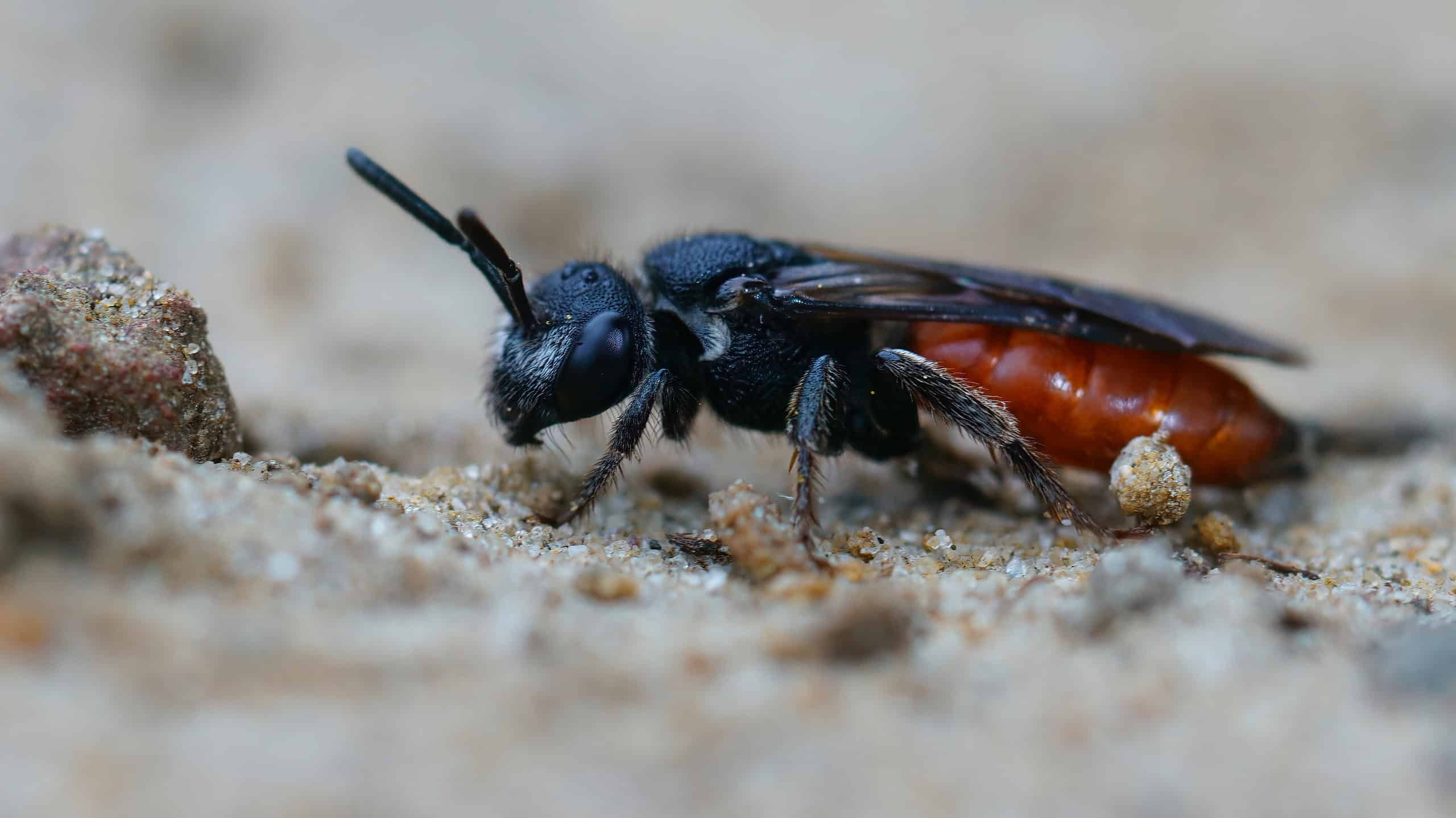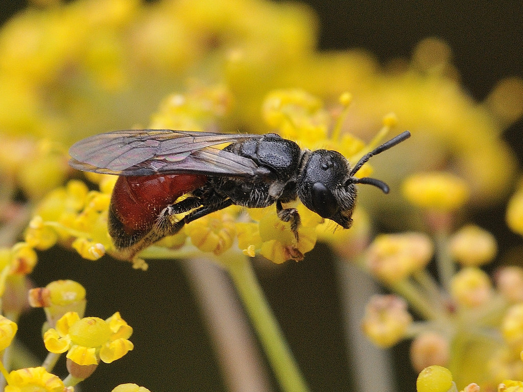 The box-headed blood bee is an unusual black bee due to its brightly colored red abdomen. The medium to large slender black and red bee has black wings, short, stumpy antennae, and fuzzy legs covered in whitish-gray hairs. Additionally, the white hairs on the black head and thorax give the bee a grayish appearance.