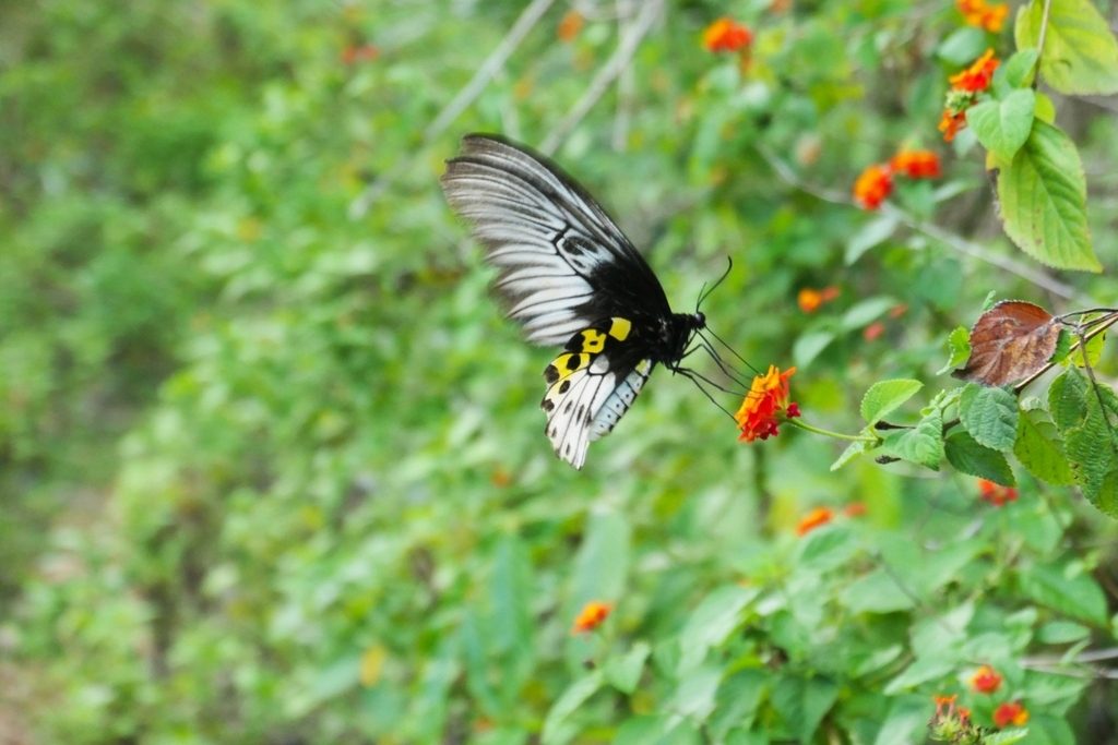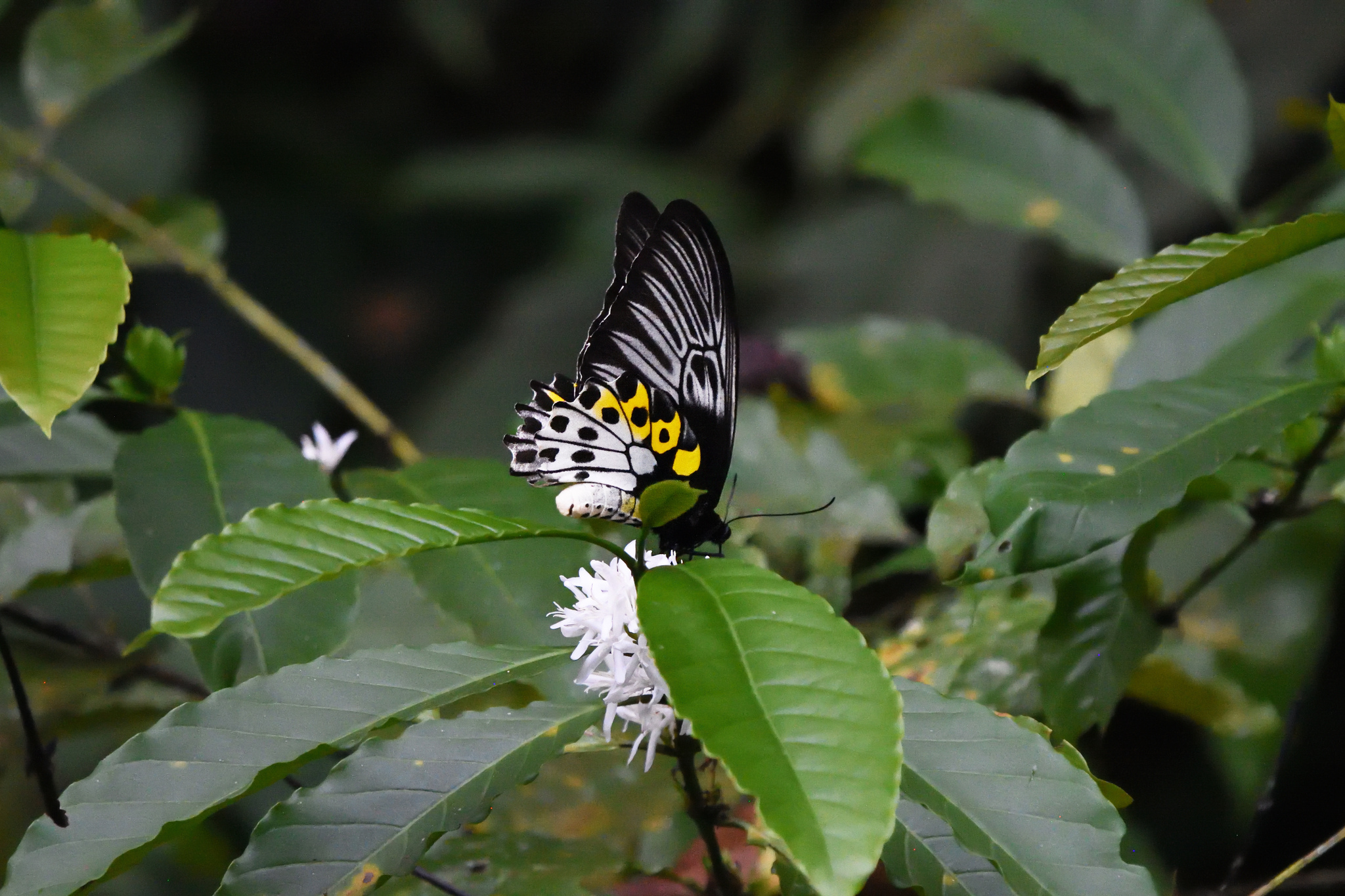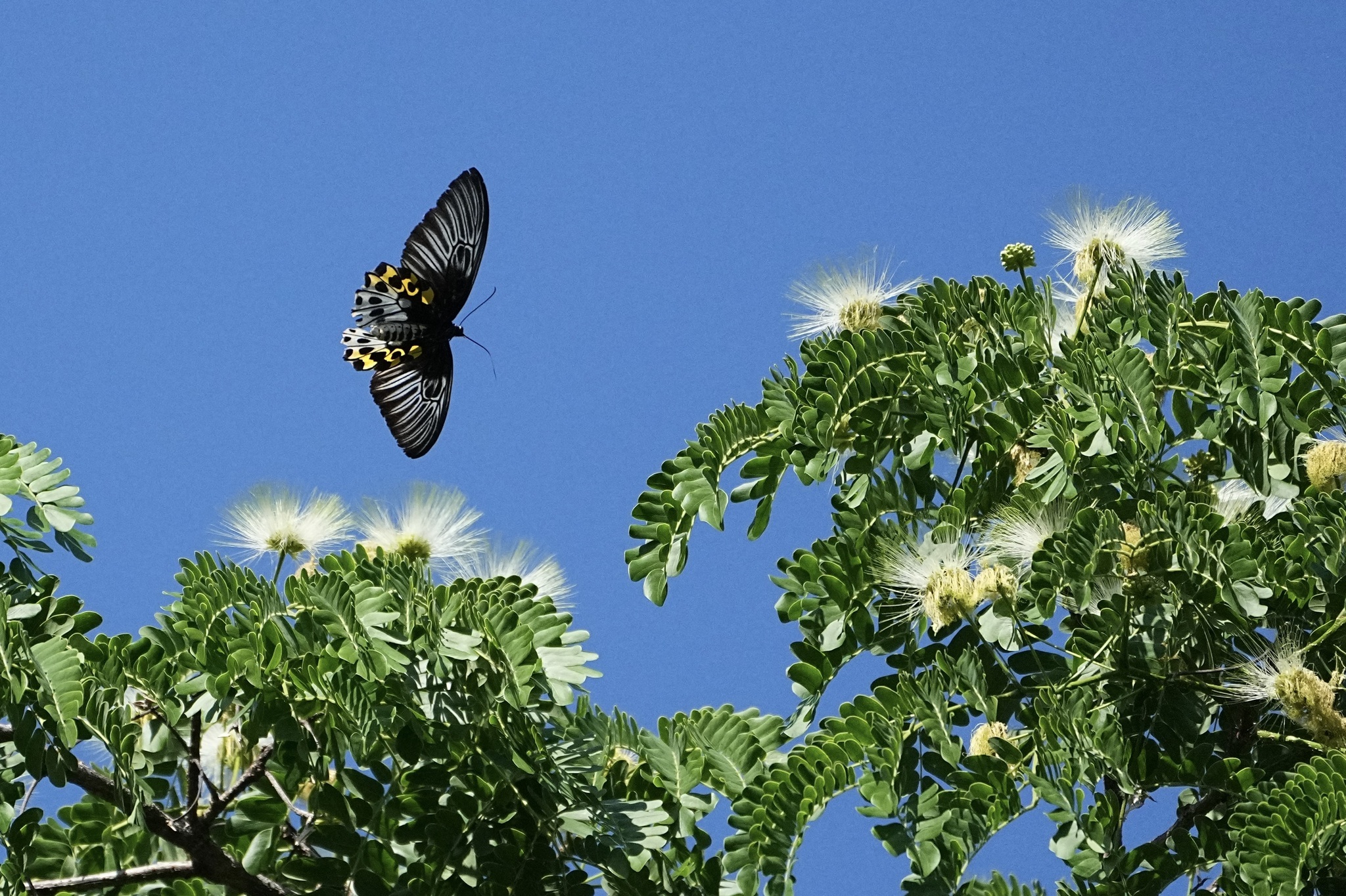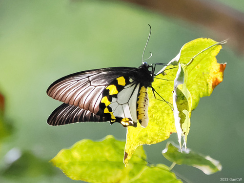 It has a wingspan of about 20 cm and is yellowish black in colour with white highlights on the veins and lower wings. Also, it has a change of Golden spots on the hindwings.