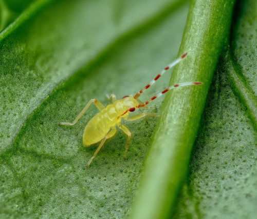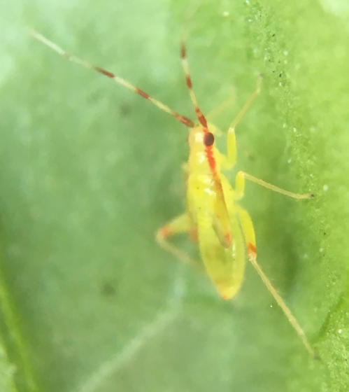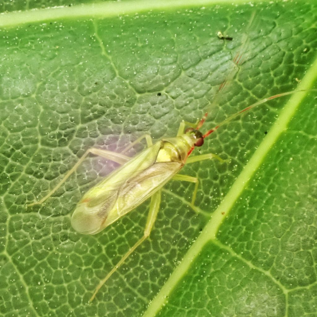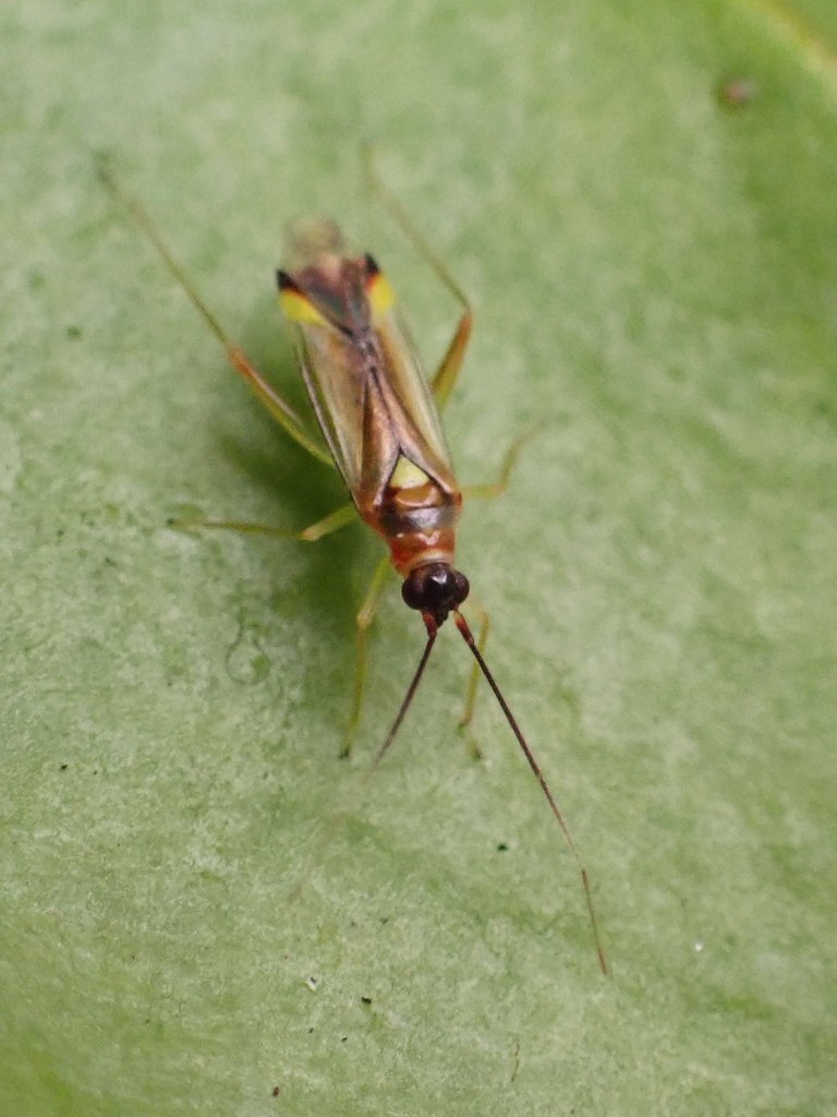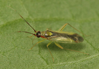 Campyloneura virgula is a distinctively marked species which has very long antennae and a bright yellow cuneus, tipped with dark red. Nymphs are yellow, with red-banded antennae and a red stripe on the margins of the pronotum. Males are extremely rare; raising the possibility that C. virgula might be parthenogenetic.