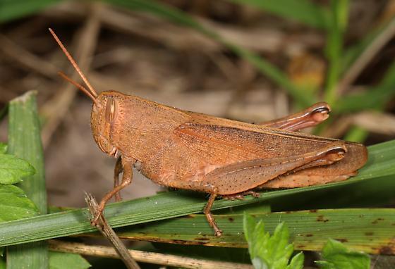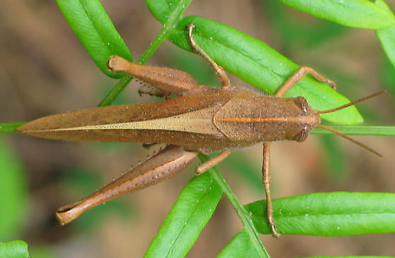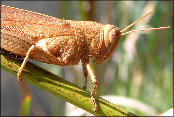 They are uniformly brown overall with a cream-colored dorsal stripe. Adult females have much shorter wings than males and are flightless, which is unique among Schistocerca.