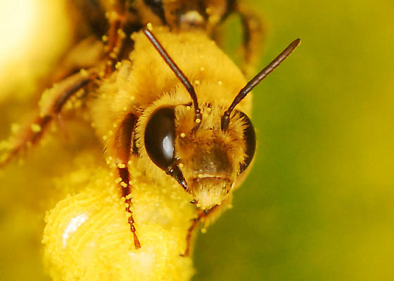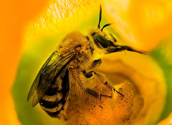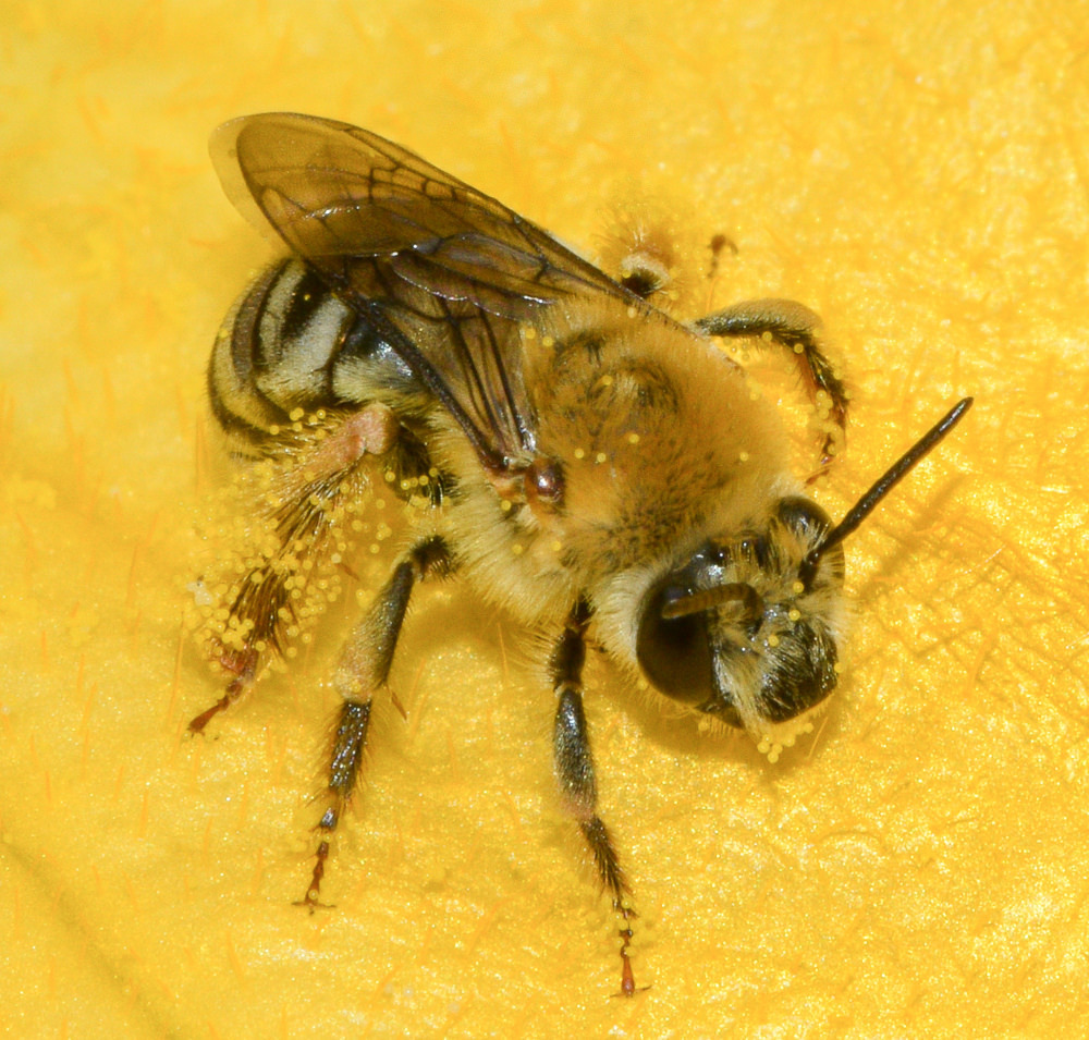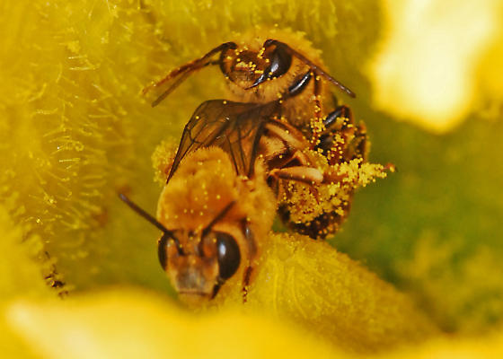 Squash bees (Peponapis and Xenoglossa) evolved in tandem with squash plants, which are native to the Americas. These wild bees are specialist pollinators – they visit cucurbits, that is, squashes, pumpkins, gourds and melons. The bees’ geographical range coincides precisely with the range of such plants. Although domestic honey bees may be seen at times feeding on the nectar of squash blossoms, squash bees are such efficient pollinators that they generally succeed in pollinating all of the flowers of a squash plant by early morning, before honey bees brought in as crop pollinators reach the blossoms.