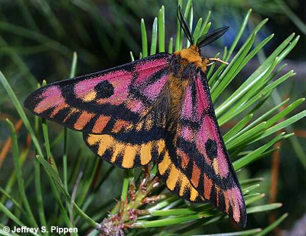 Its forewings are pink with a yellow streak in the middle and the hindwings are yellowish with variable black markings. The larvae are black with branched yellowish spines that become orange in later development and an orange-brown head.