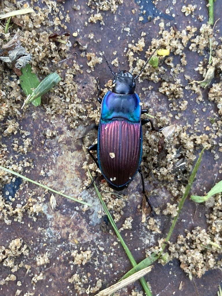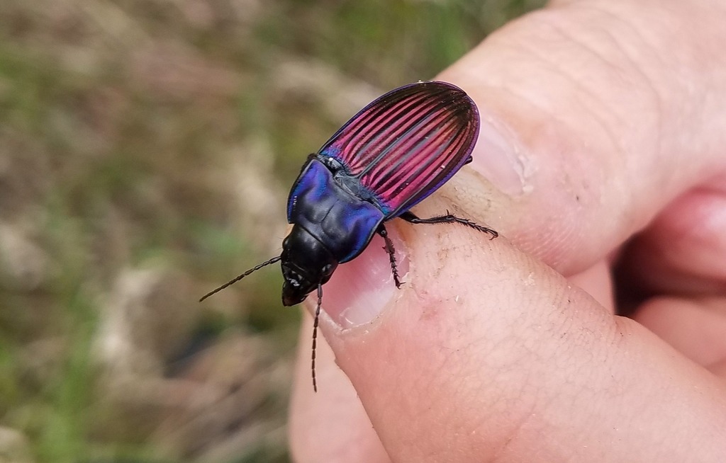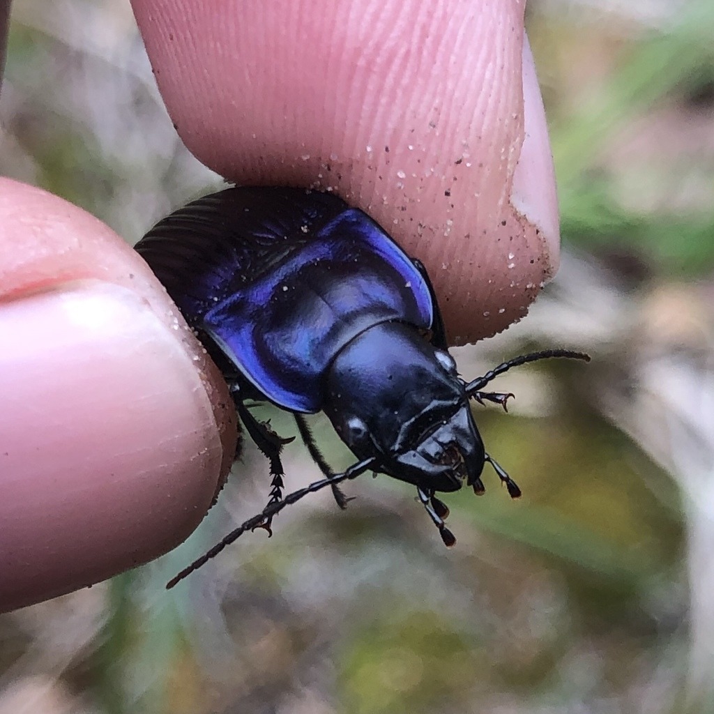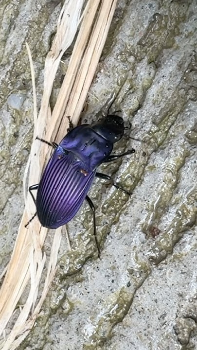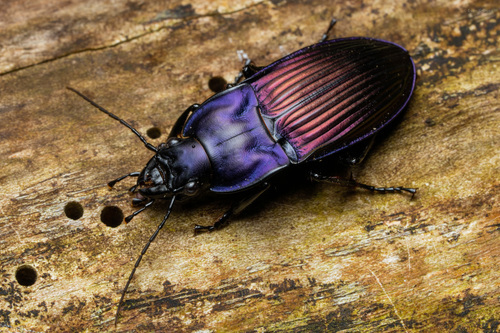 Varying colors are specific to the Notch-mounted Ground Beetle (Dicaelus purpuratus). This ground dweller is often purple or blue and purple with a shiny exoskeleton.