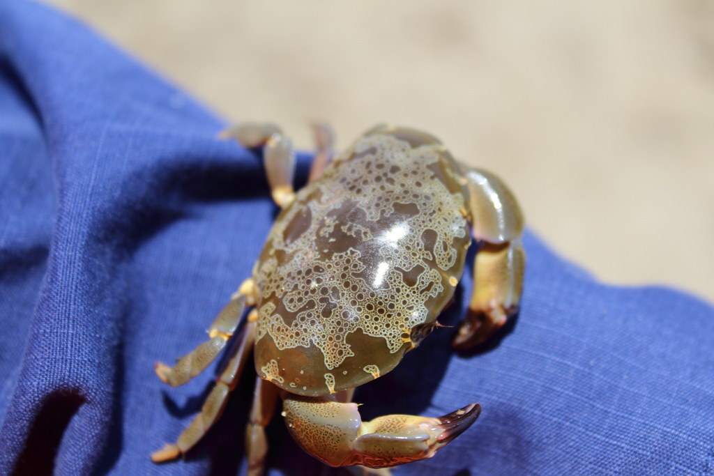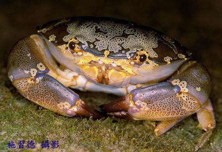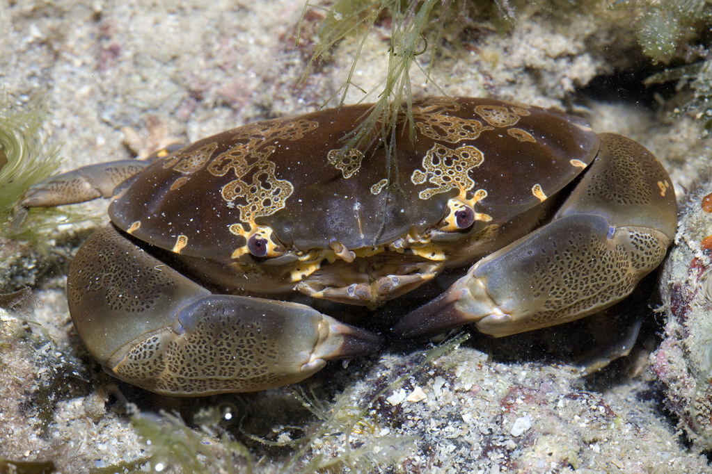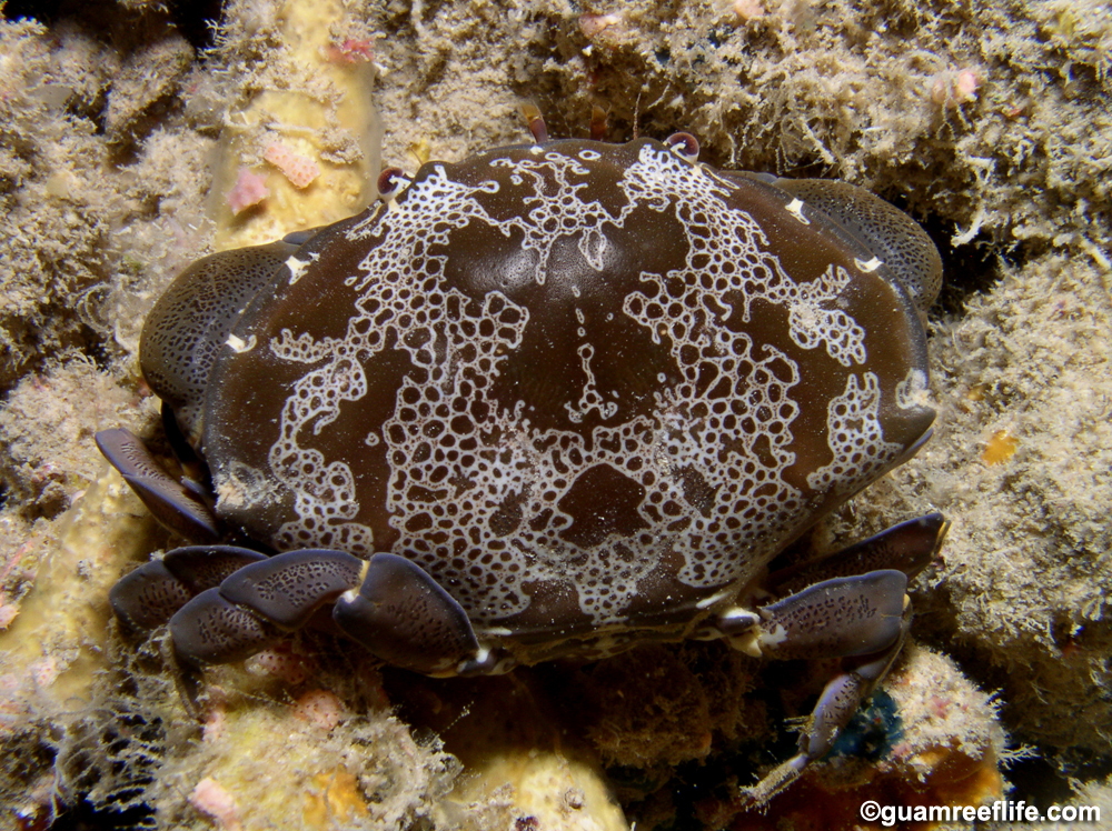 Atergatis floridus, the floral egg crab, green egg crab, pancake crab, or shawl crab, is a species of tropical Indo-Pacific crab found in shallow beaches. The smooth carapace is covered with lacework pattern. The pair of pincers is equal in size with black tips. This species contains paralytic shellfish toxins which are considered lethal when ingested by humans.