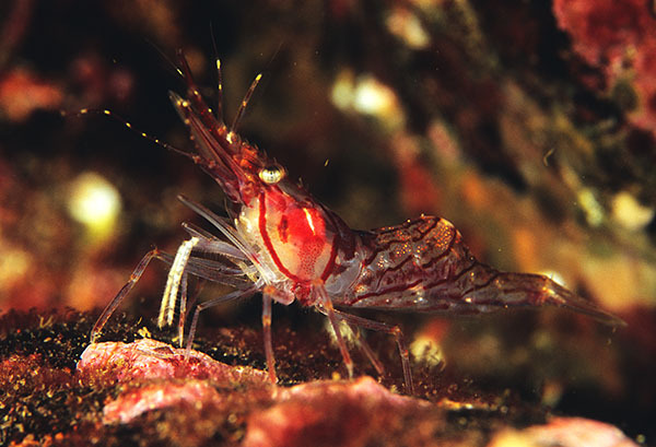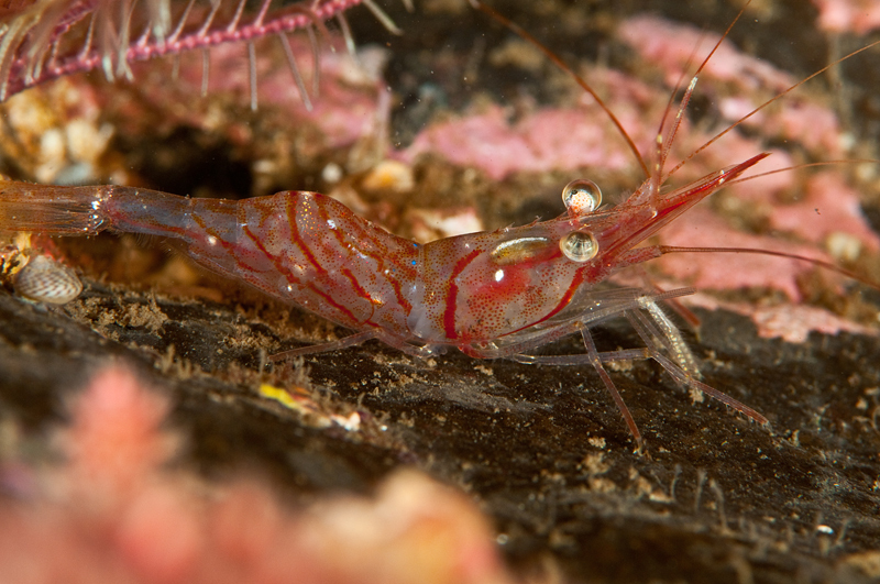 The Coonstripe Shrimp is a medium sized crustacean that can be identified by the thin diagonal stripes along its abdomen. It varies in colour, but often has a mix of brown, red, and white surrounding its semi-translucent body. The translucency is used for camouflage and may make them difficult to spot from the surface.