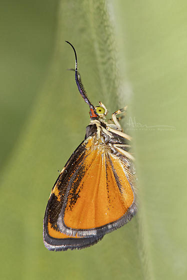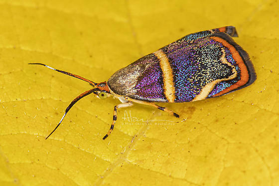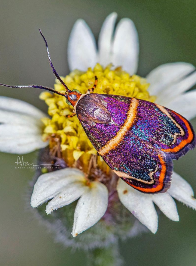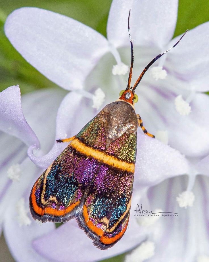The Diva moth is from the family of Choreutidae and was discovered by Riley in 1889. Its brilliant purple, blue, and light orange hues make it stand out in sunlight.