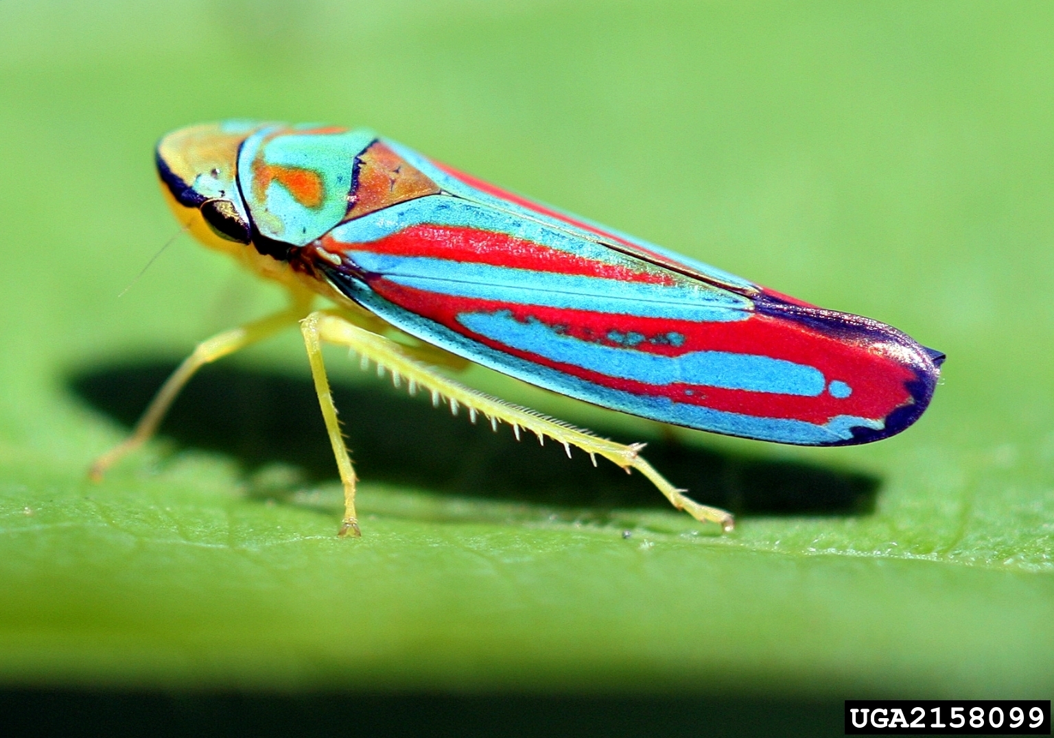 Redbanded leafhoppers feed on fruit bushes and ornamental plants including crapemyrtle, rhododendron, roses, and Scotch broom. As this leafhopper uses its mouthpart to pierce and suck plant sap, it also injects its saliva. It can transmit Pierce’s Disease (leaf scorch) to grape, oak, elm, sycamore, and other trees and shrubs.