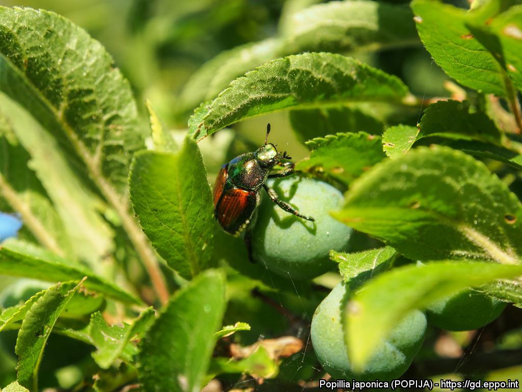 The Japanese beetle has become a serious plant pest and a threat to American agriculture. The adult beetles damage plants by skeletonizing the foliage (i.e., consuming only the material between a leaf's veins) as well as, at times, feeding on a plant's fruit. The subterranean larvae feed on the roots of grasses.