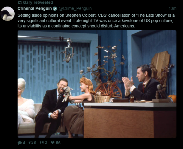 Late night television talkshows and by extension the 24 hour news cycle is dieing, not for any ideological reason but because it's been made irrelevant by content consumption culture via the internet; we are on the precipice a new monoculture being formed, we just cant see it yet -