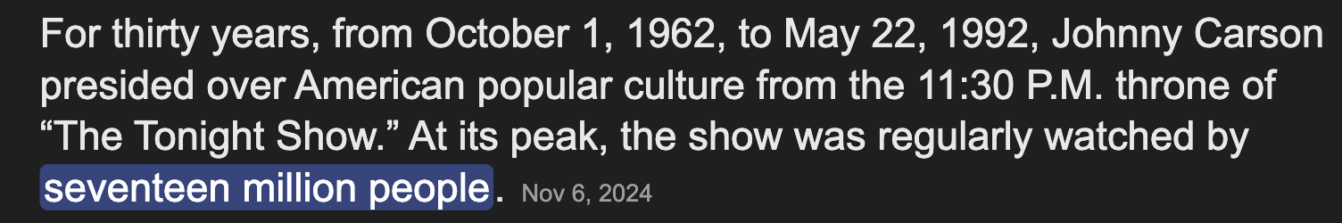 @nomebullyyou @sickburnbro If these numbers are right, then Johnny Carson was 6+ times more popular in absolute numbers and 10+ times more popular accounting for population size differences. And Charles Coughlin in the 1930's was more popular than every modern late night host combined. -
