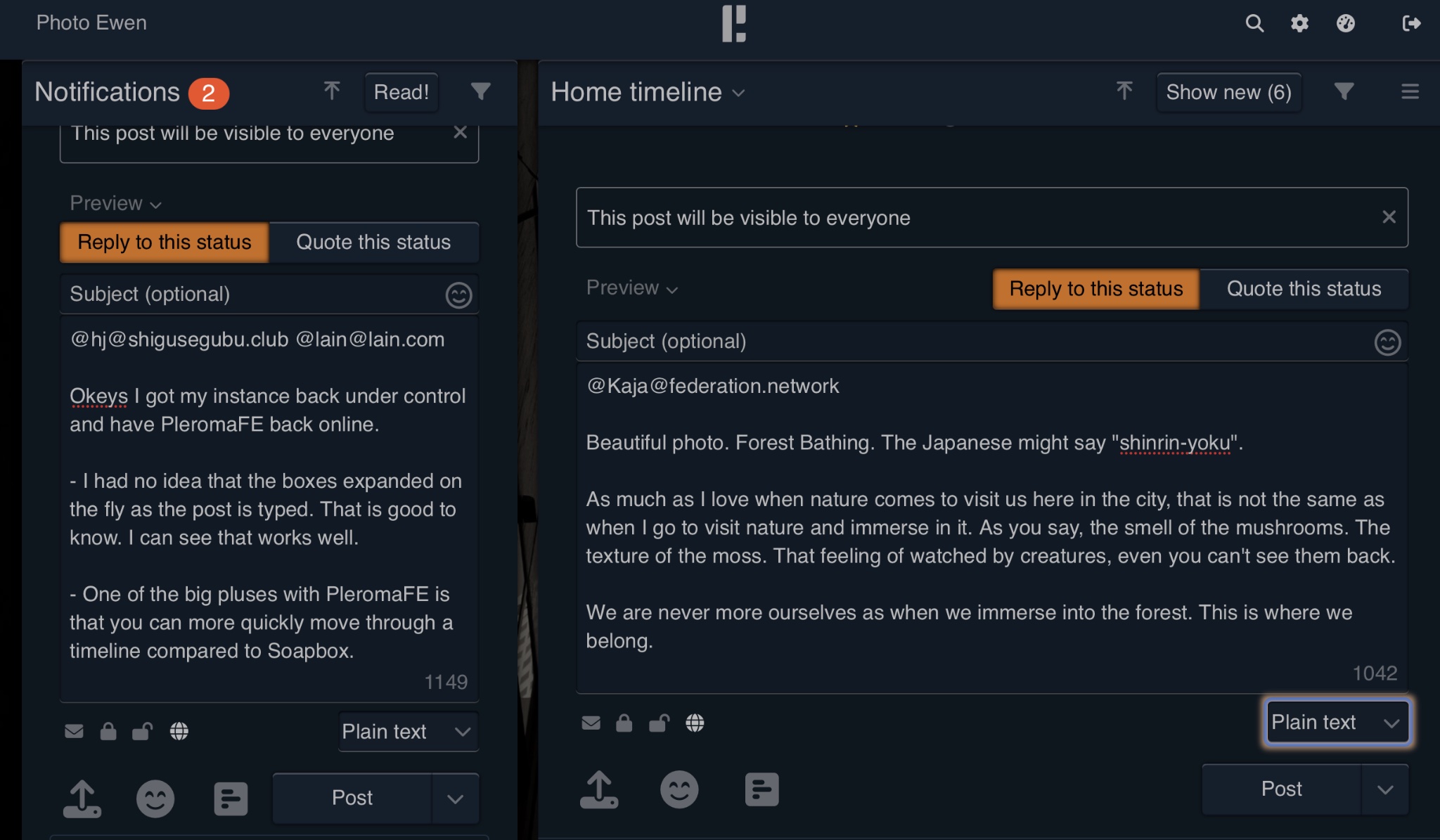 - One of the big pluses with PleromaFE is that you can more quickly move through a timeline compared to Soapbox. When my brain is moving fast, this is a bonus. And I can see that being able to respond to a post without leaving the timeline can be helpful to keep your train of thought.