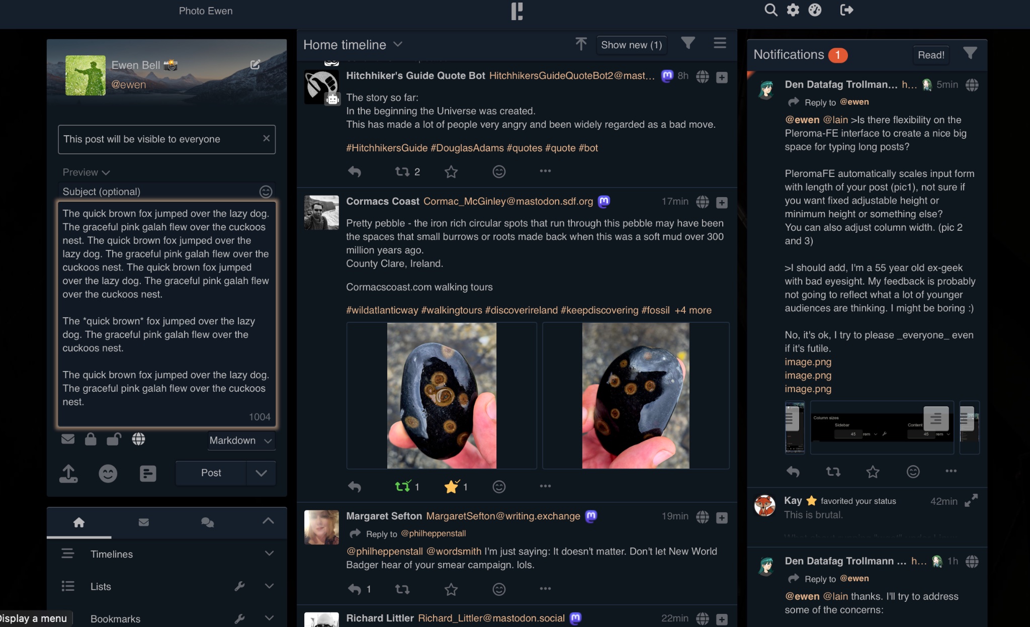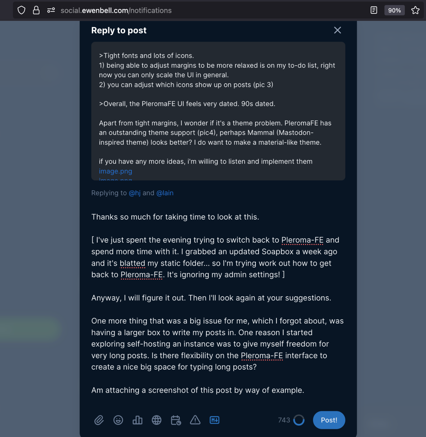 @ewen@lain >Is there flexibility on the Pleroma-FE interface to create a nice big space for typing long posts?