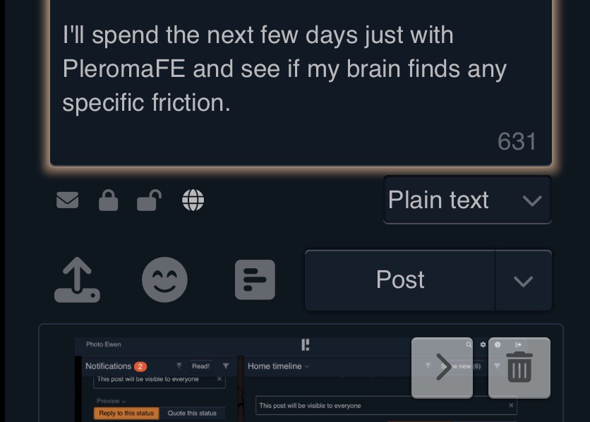 I'll spend the next few days just with PleromaFE and see if my brain finds any specific friction.
