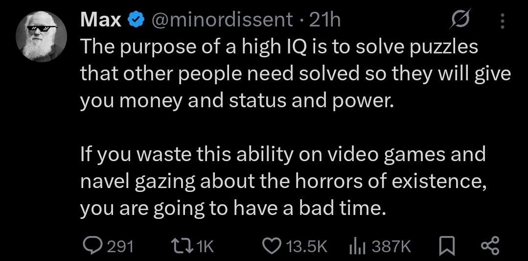 @merchantHelios i am a complete midwit (got 60 on an iq test), and I'd much rather just play vidya, do my thing, and live comfily. -