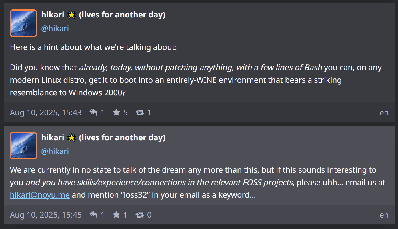 • Try ReactOS again, but with Linux+Wine instead of the ReactOS kernel.