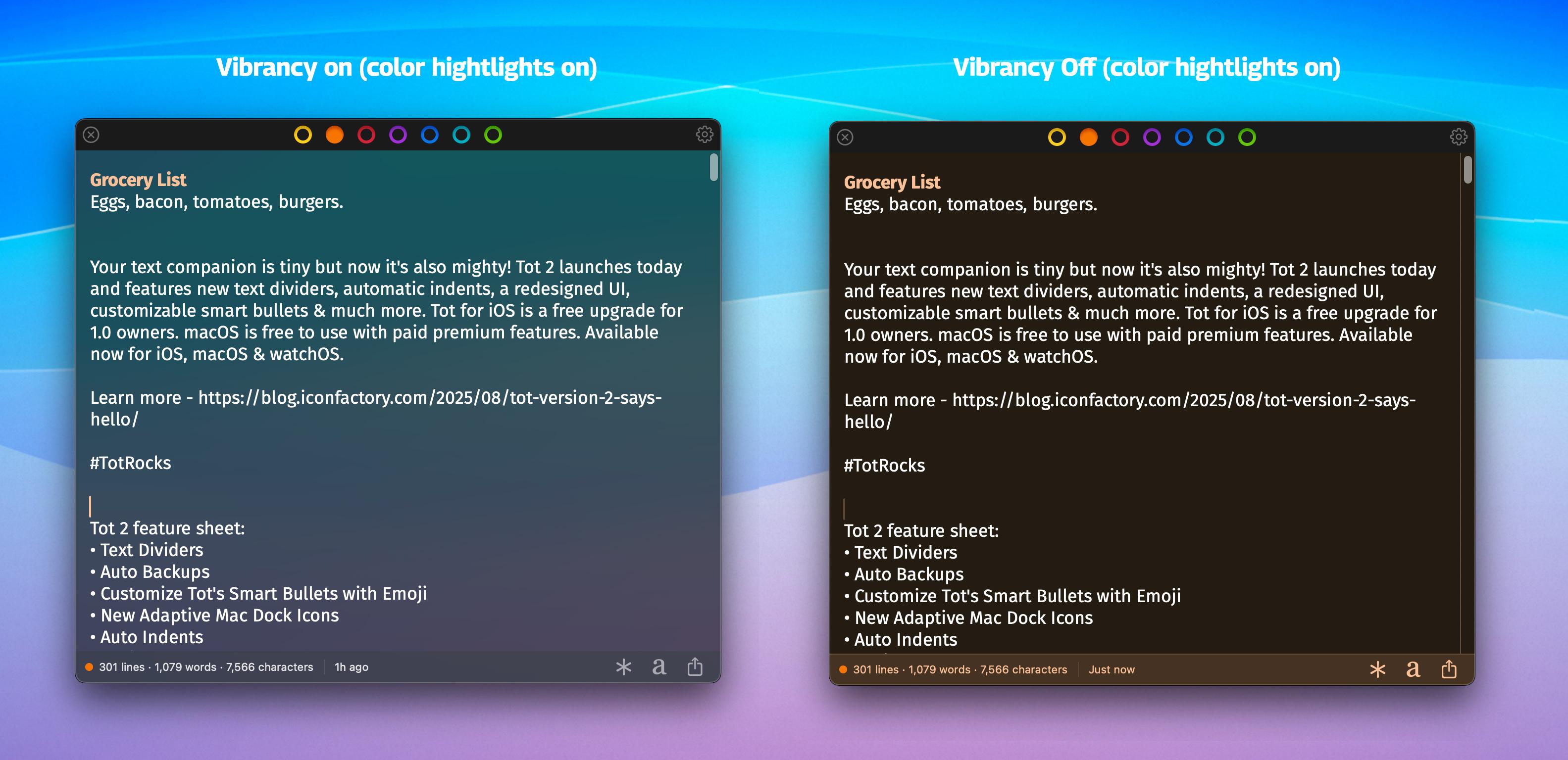 One of the late additions to Tot 2 on the Mac was the vibrant window background Setting. I convinced @chockenberry to give it a go and while he wasn’t really fond of it, I loved it. It really makes Tot feel modern and fresh. This what Liquid Glass is supposed to feel like, right? 😅