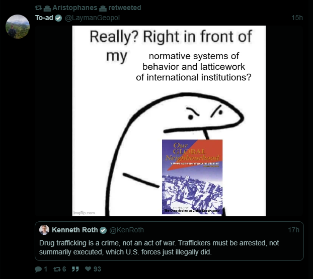 @sickburnbro I asked an AI and it basically said something about the international implications of a country's military forces doing extrajudicial killings in another country. Regardless of international rules of engagement, I can't imagine ever crying over the death of drug traffickers, especially brown ones. Fucking degenerates, protecting criminals once again. 😐