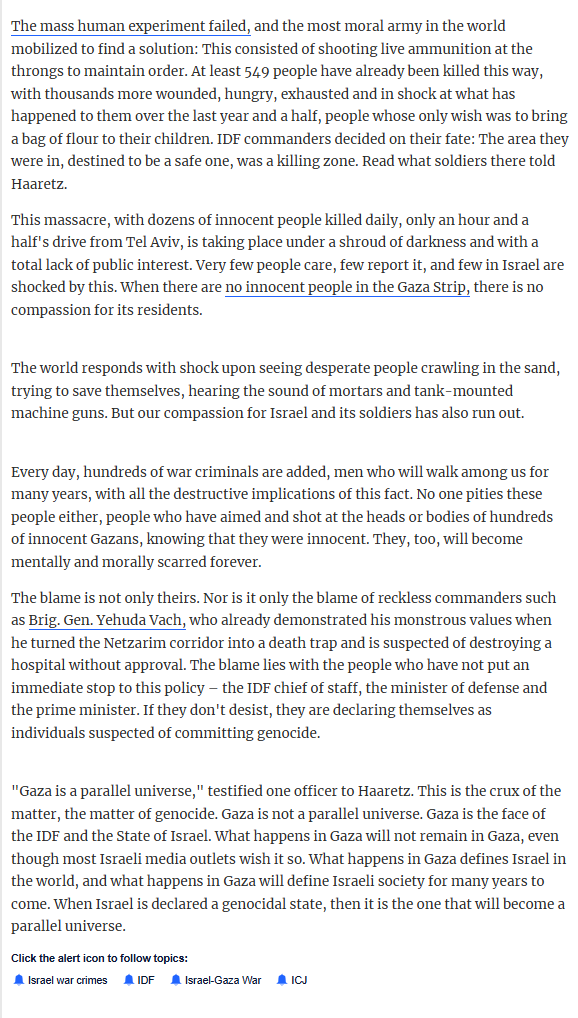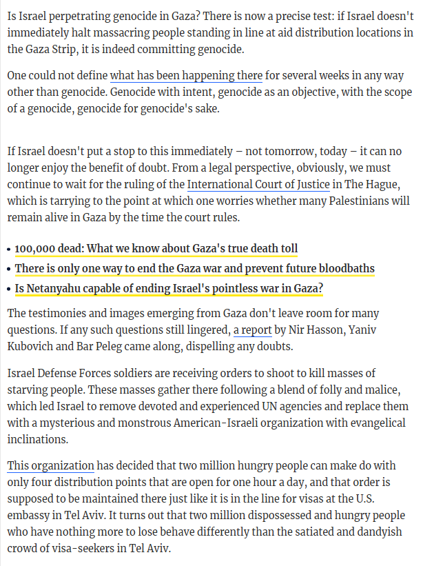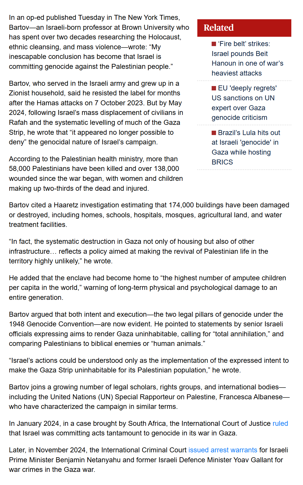 A sostegno dell'ipotesi di #Genocidio in #Palestina c'è anche Luigi Daniele, an international law expert and senior lecturer at Nottingham Trent University. According to him, continued restrictions to humanitarian aid could amount to a violation of the Genocide Convention, particularly regarding the prohibition of genocide by imposing destructive living conditions on a targeted group.