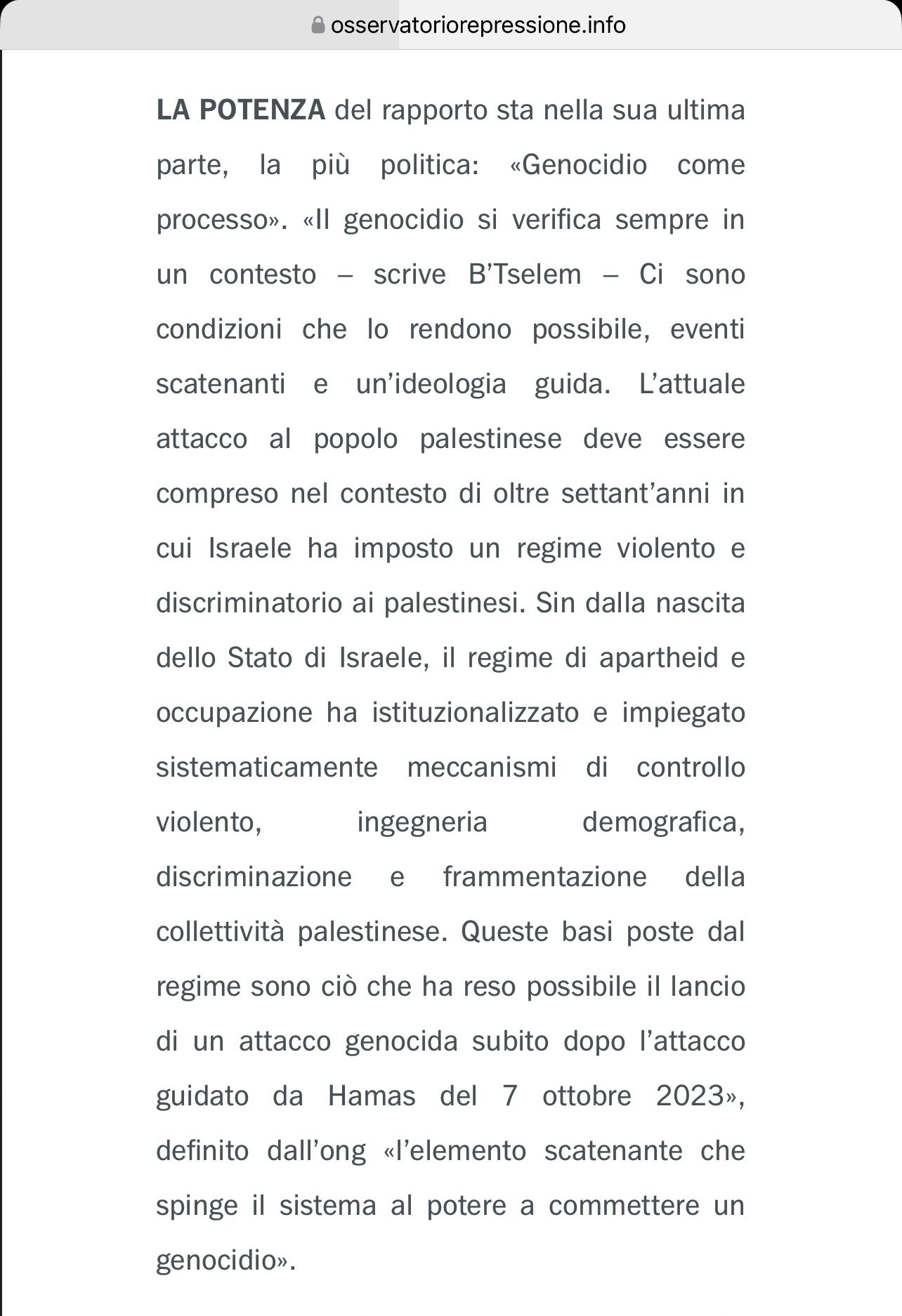 Ipotesi di #Genocidio in #Palestina: sostenuta dalla ONG israeliana B’TSELEM. In ebraico B’TSELEM significa “a sua immagine”, e indica il rispetto riconosciuto dall’ebraismo ad ogni vita umana, in quanto immagine di Dio, espressione di una forza vitale più grande dell’individuo che i laici possono chiamare umanità. Nel rapporto “our genocide” si legge che il genocidio non minaccia solo i palestinesi, ma tutto il diritto internazionale, quindi anche noi.