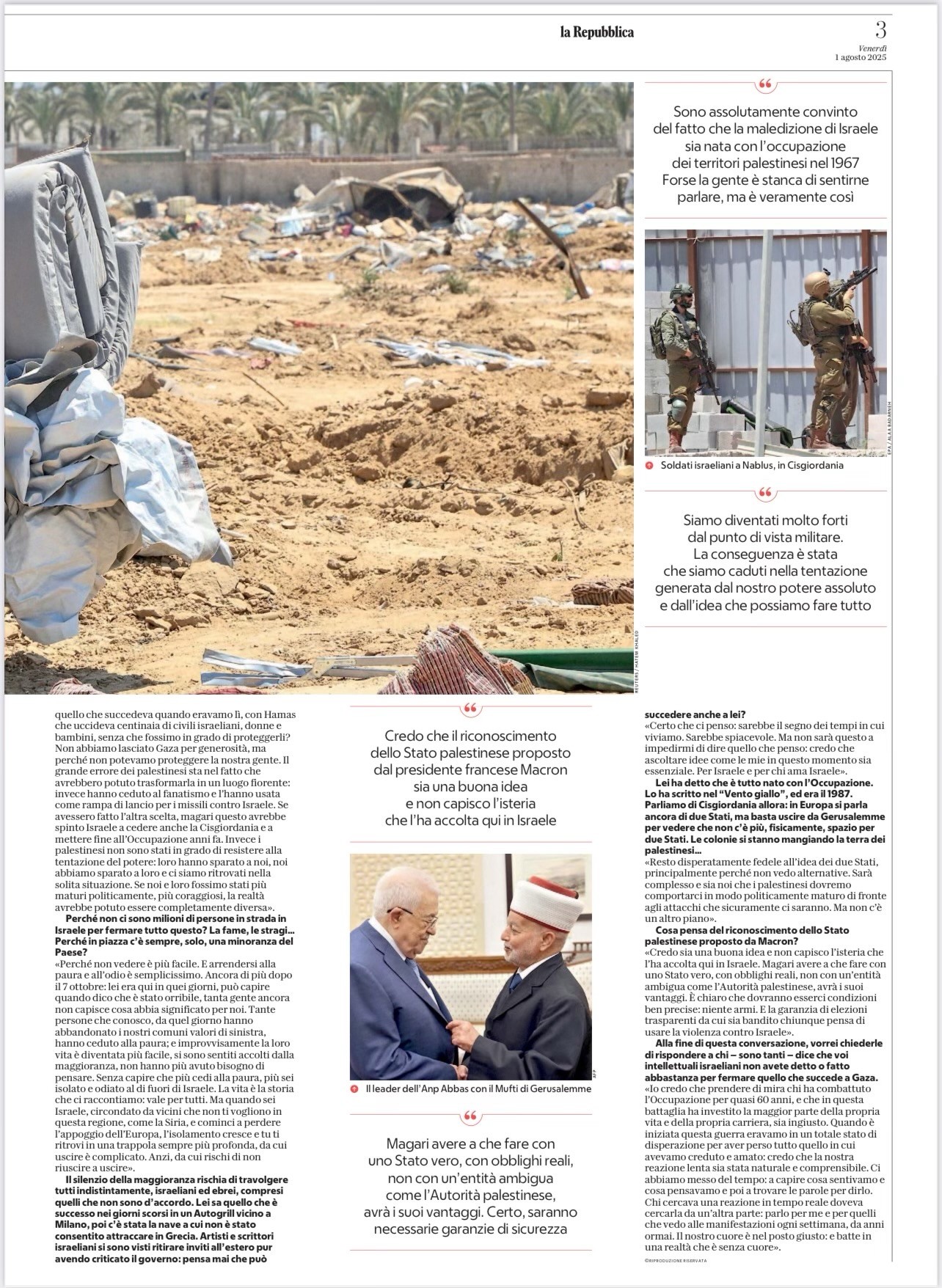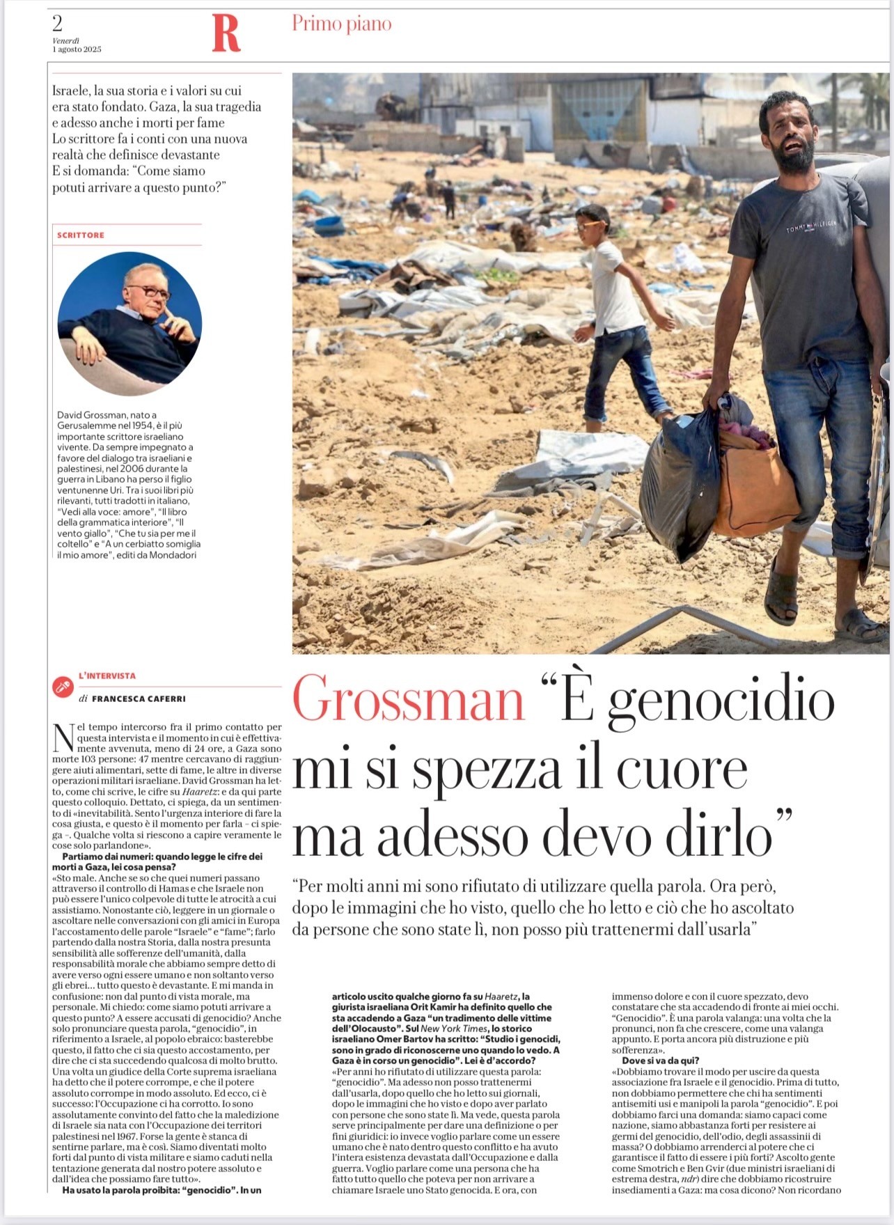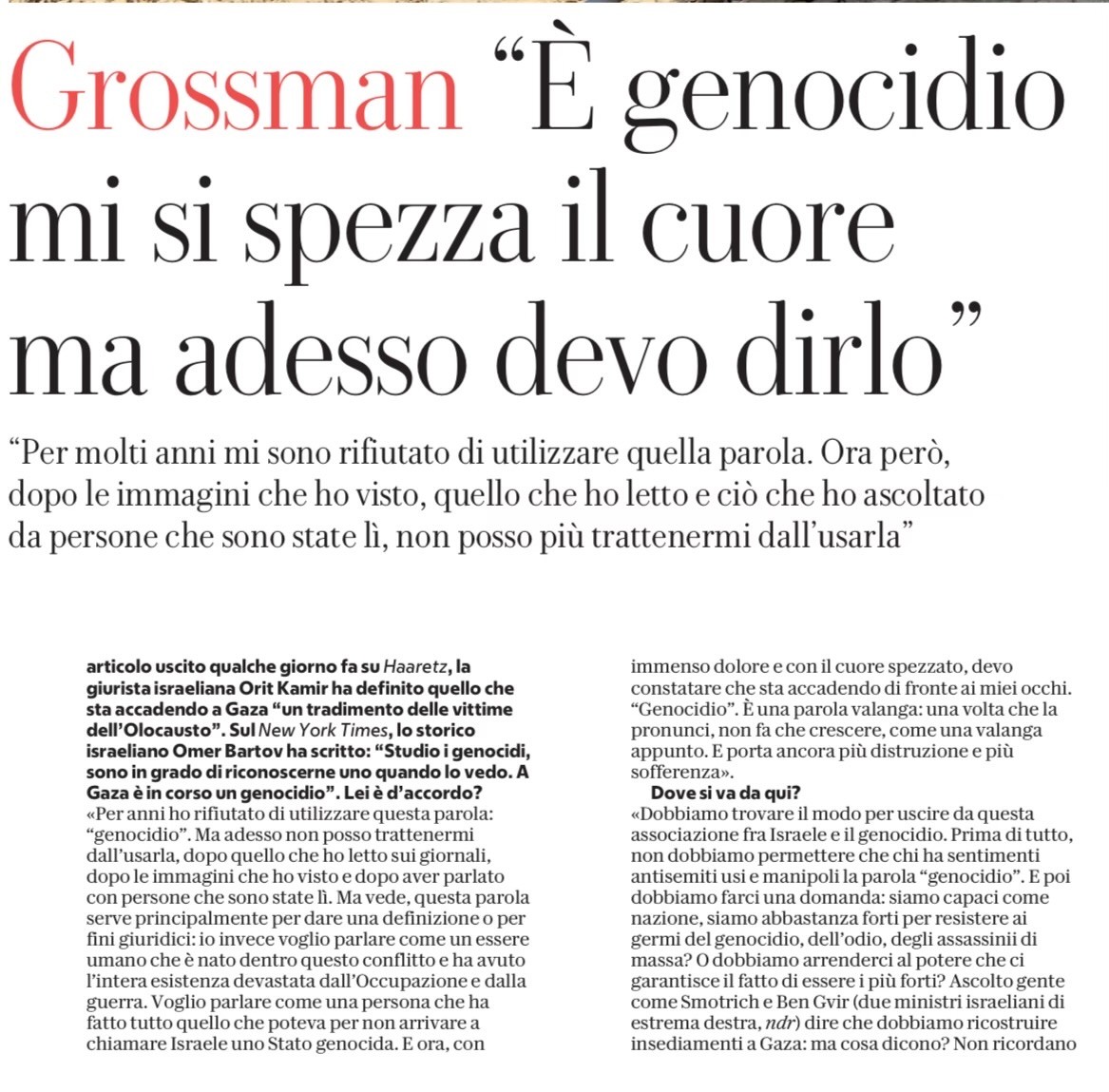 Ipotesi di #Genocidio in #Palestina: sostenuta da David Grossman, nato a Gerusalemme nel 1954, tra i più rilevanti scrittori israeliani viventi. Da sempre impegnato a favore del dialogo tra israeliani e palestinesi, nel 2006 durante la guerra in Libano ha perso il figlio ventunenne Uri.