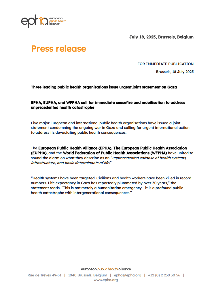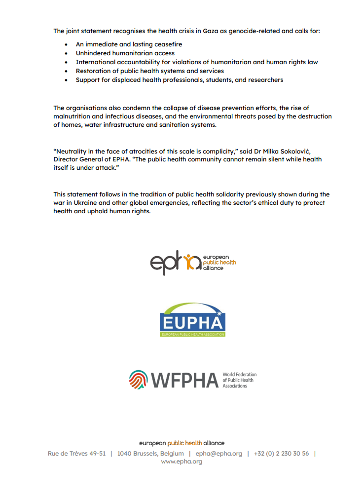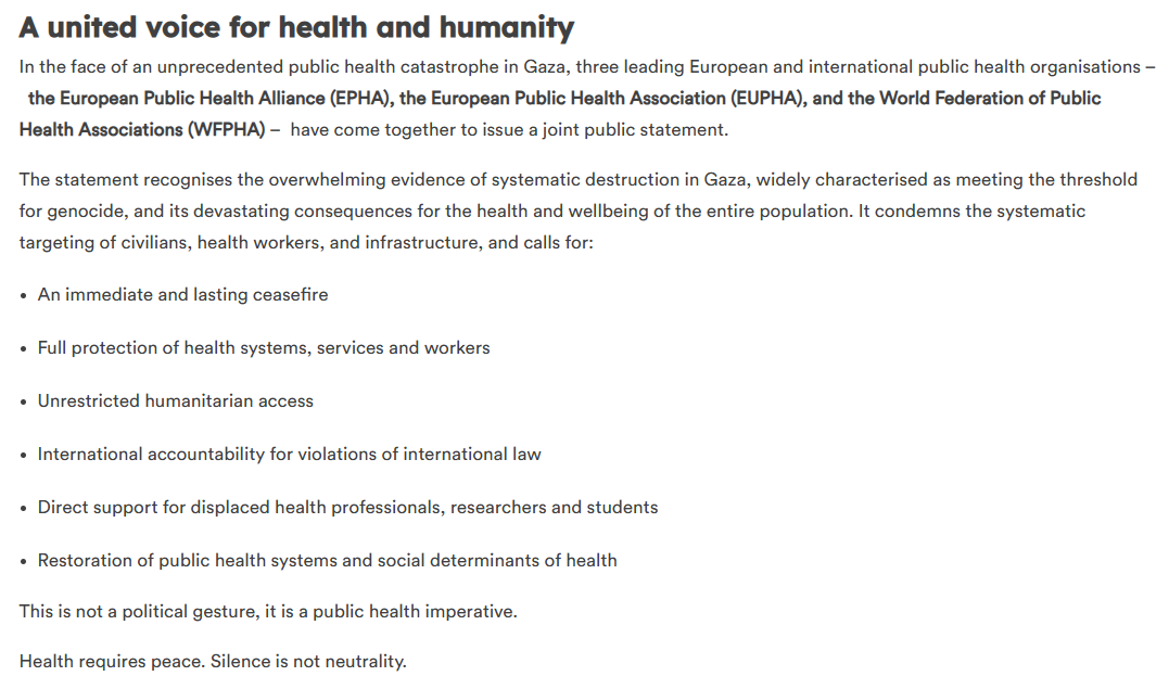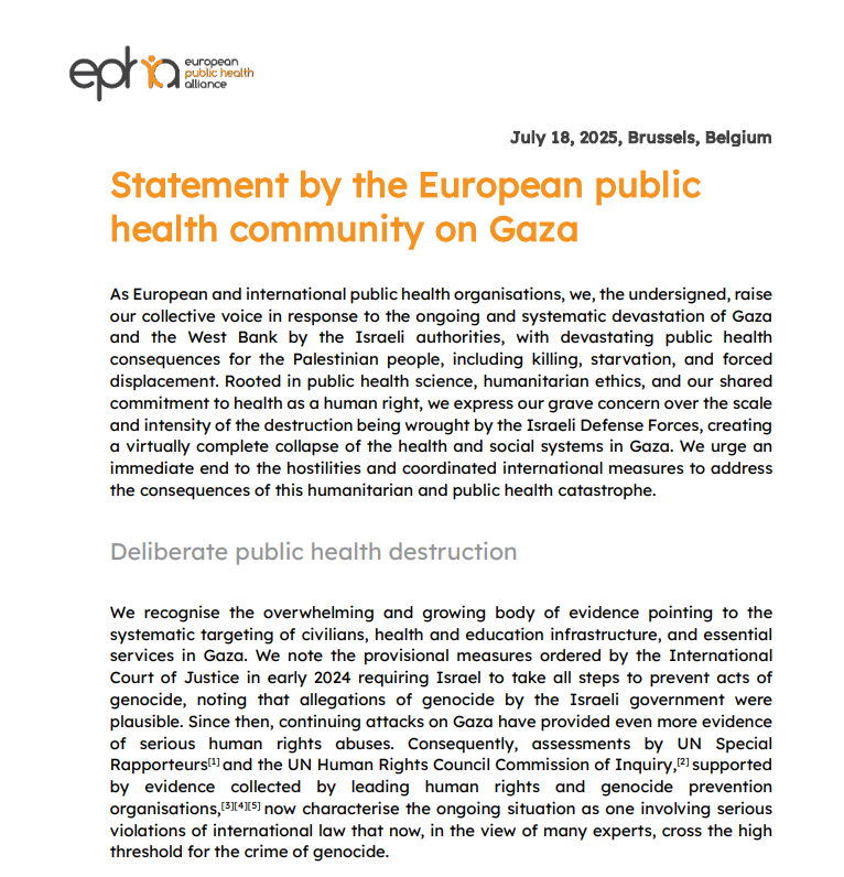 Ipotesi di #Genocidio in #Palestina: sostenuta da tre delle più importanti società scientifiche (European Public Health Alliance - EPHA, European Public Health Association - EUPHA, e la World Federation of Public Health Associations - WFPHA) con più di 5 milioni di iscritti tra ricercatori e professionisti della salute pubblica.