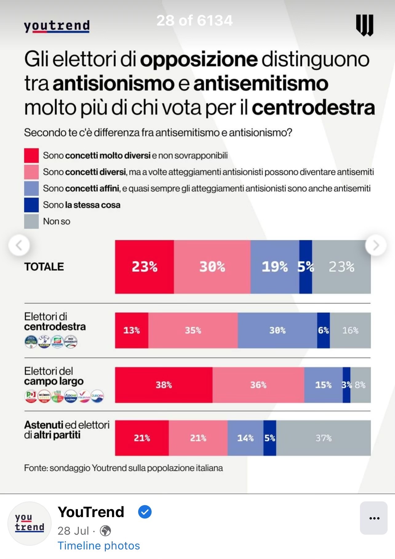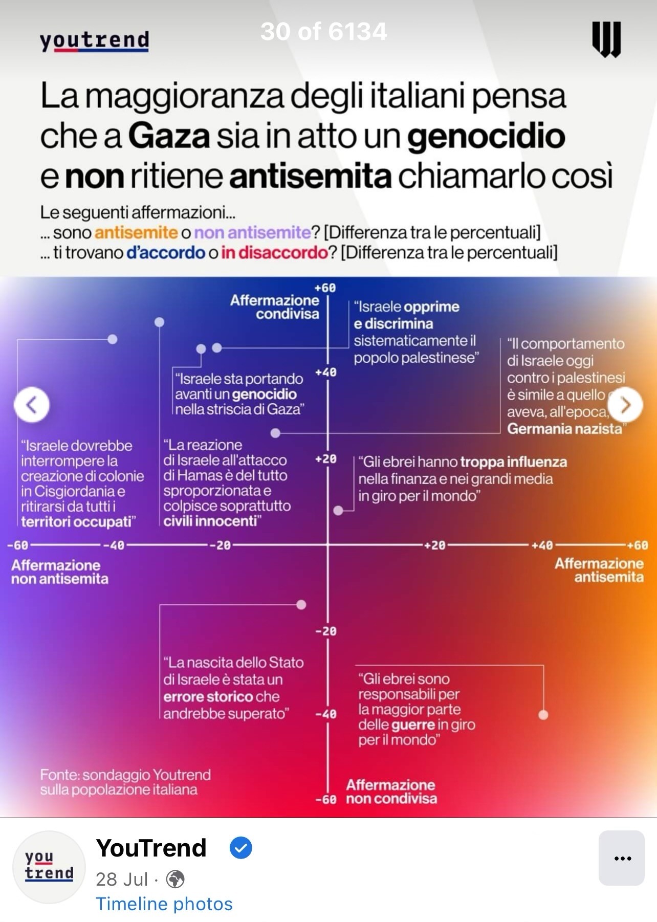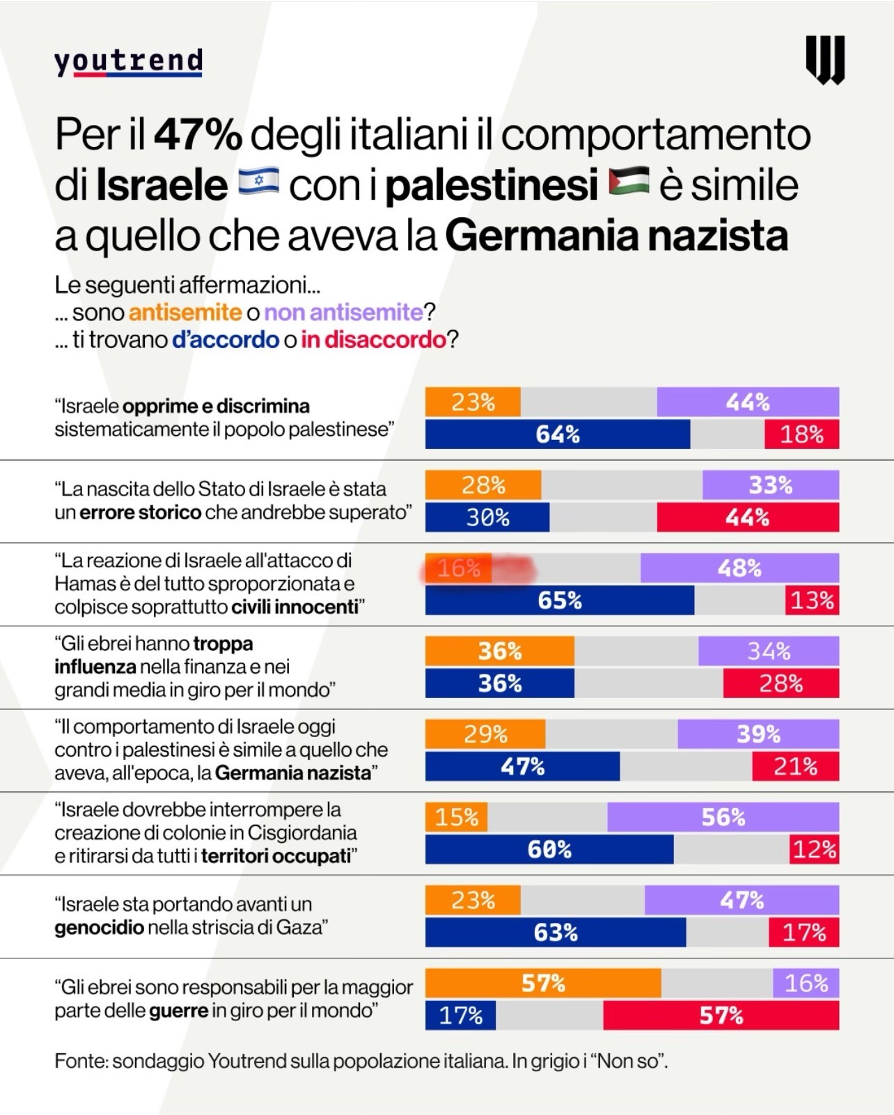 Ipotesi di #genocidio in #Palestina: sostenuta dal 63% dell’opinione pubblica italiana interpellata in un sondaggio #Youtrend dove c’è anche il 47% degli intervistati che rileva una similitudine tra le azioni dello Stato di Israele e quelle della Germania Nazista, con considerazioni sul colonialismo sionista analoghe a quelle espresse da Albert Einstein e Hannah Arendt nel 1948, agli esordi di questo fenomeno, con la differenza che ora tali considerazioni sono bollate come antisemite.