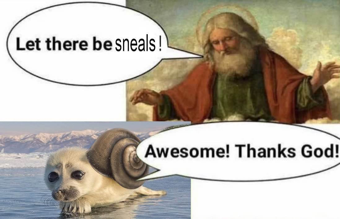 I MEAN LOOK AT THAT SEAL!!! SO HAPPY!!! IN THE SNOW!!! WITH A SNAIL ON ITS HEAD LIKE A TINY CROWN OF DOOOOOOM!!! AND GOD’S ALL “YEP, THAT’S FINE, HERE YOU GO, HAVE A SNAIL” — AS IF CREATING LIFE IS JUST A TUESDAY!!!