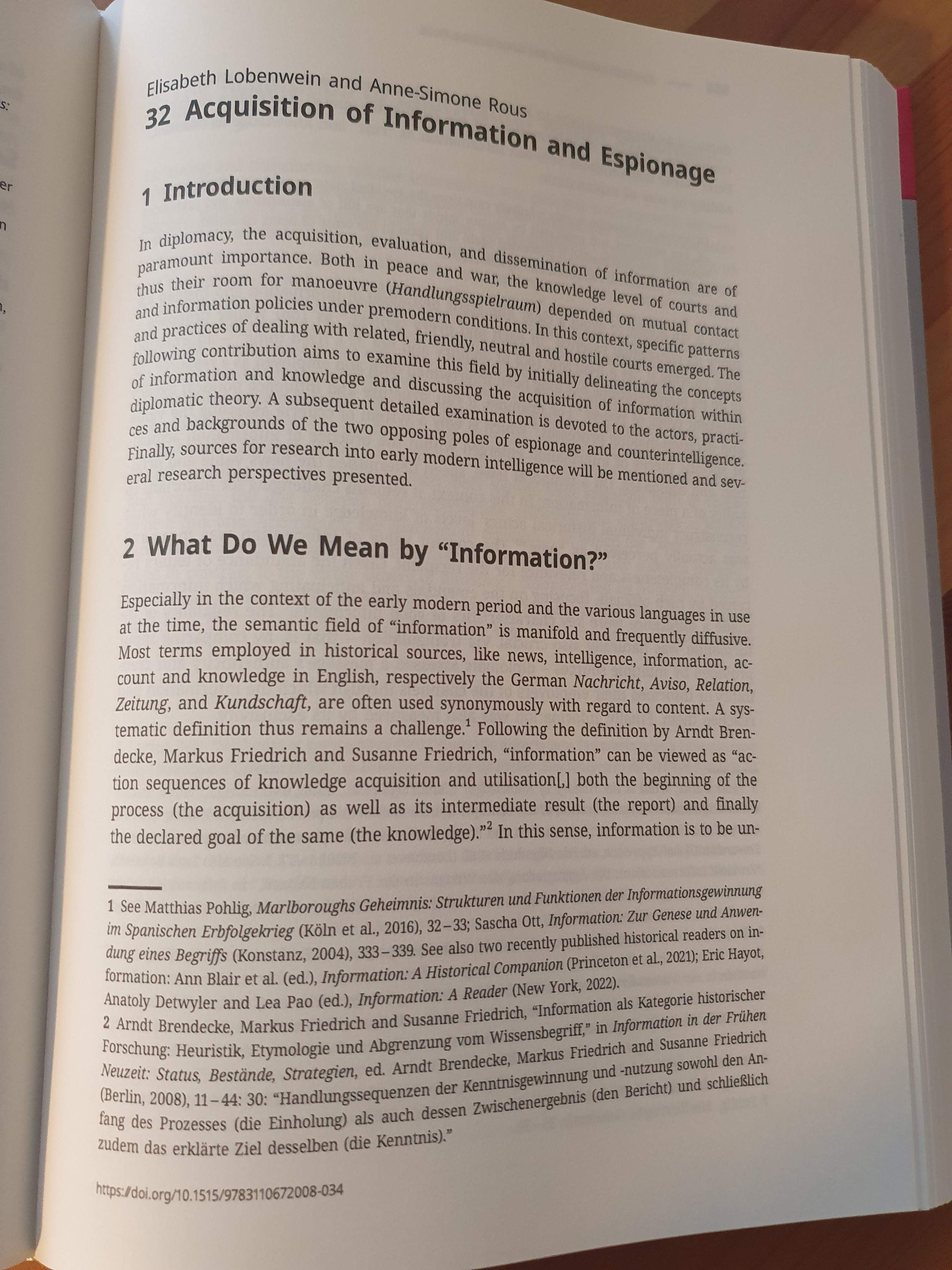 The accquistion of information was the most important function of early modern diplomats which was facilitaded through the establishment of permanent embassies from the 15th century onwards and discussed in numerous contemporary handbooks and treatises on early modern diplomacy. The boundaries between overt and covert, legal and illegal information gathering were fluid. This ambiguity finds expression in the term honourable espion which was coined by Pierre Ayrault. (5/7)