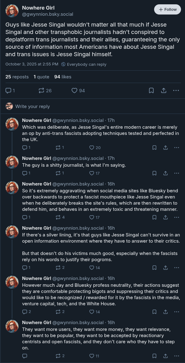 @raccoon@hollow.raccoon.quest @sun@shitposter.world I feel that although Bluskey bending its rules to allow Jesse Singal and its upcoming ToS change censoring artworks with non-con/dub-con are far worse for the userbase, this shit showed how immature the team is with any level of user support. Jay should've just taken the L and said that the team was personally okay with people like Jesse Singal. Instead, she was trying her best to dunk on those with legitimate concerns like it's a tease on video-game trolls and not the deliberate inaction against deal-breaking issues with what is now a mainstream platform that ~40 million people have built communities in.