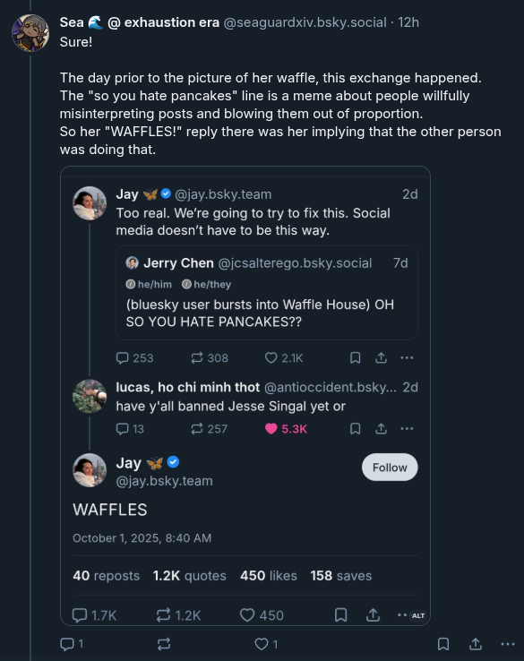 Jay replied with "waffles" and then posted a picture of her breakfast, an (admittedly really tasty looking) waffle.