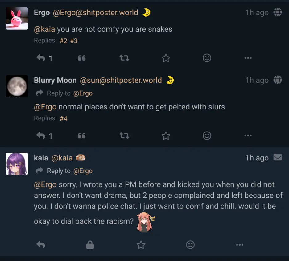 @Ergo @phnt @sun explain what it is about than like I'm 4. To me you're upset because you got banned/kicked for saying stuff you weren't post to. -