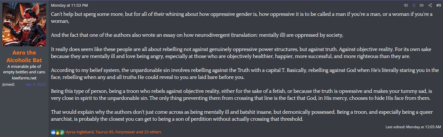 I've said it before, but we're going to see some real shit when they realize that it's over for troonkind. No more kids to rape. No more tolerance for Discord grooming. No more wearing their fetish costumes in public. No more threatening people into calling them ma'am. A brief taste of all of those things, and then it stops forever.