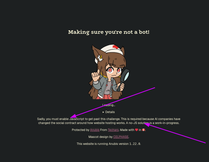 @jae @mms @m0xEE i hate the anubis stuff now because it fails for no reason for me In conversation permalink -